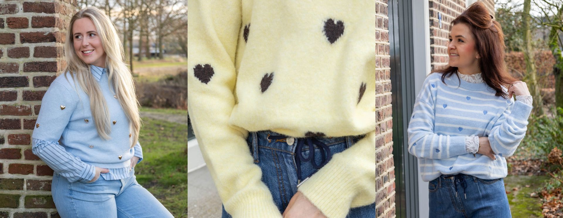 De trui met hartjesdetail en denim zorgen voor een frisse, vrouwelijke look die perfect past bij het voorjaar. Samen stralend in comfort en stijl.