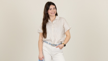 De combinatie van een bruine blazer, een gestreepte blouse en een lichte jeans zorgt voor een stijlvolle look met karakter. Afgestyled met een leopard sneaker en tas voor net dat beetje extra.