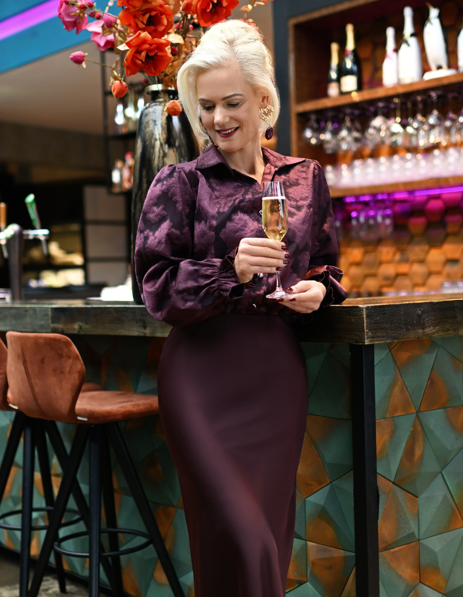 Chic in diepe, warme tinten. De satijnen rok en de sierlijke blouse vormen samen een elegante feestlook die perfect is voor een stijlvolle avond uit.✨