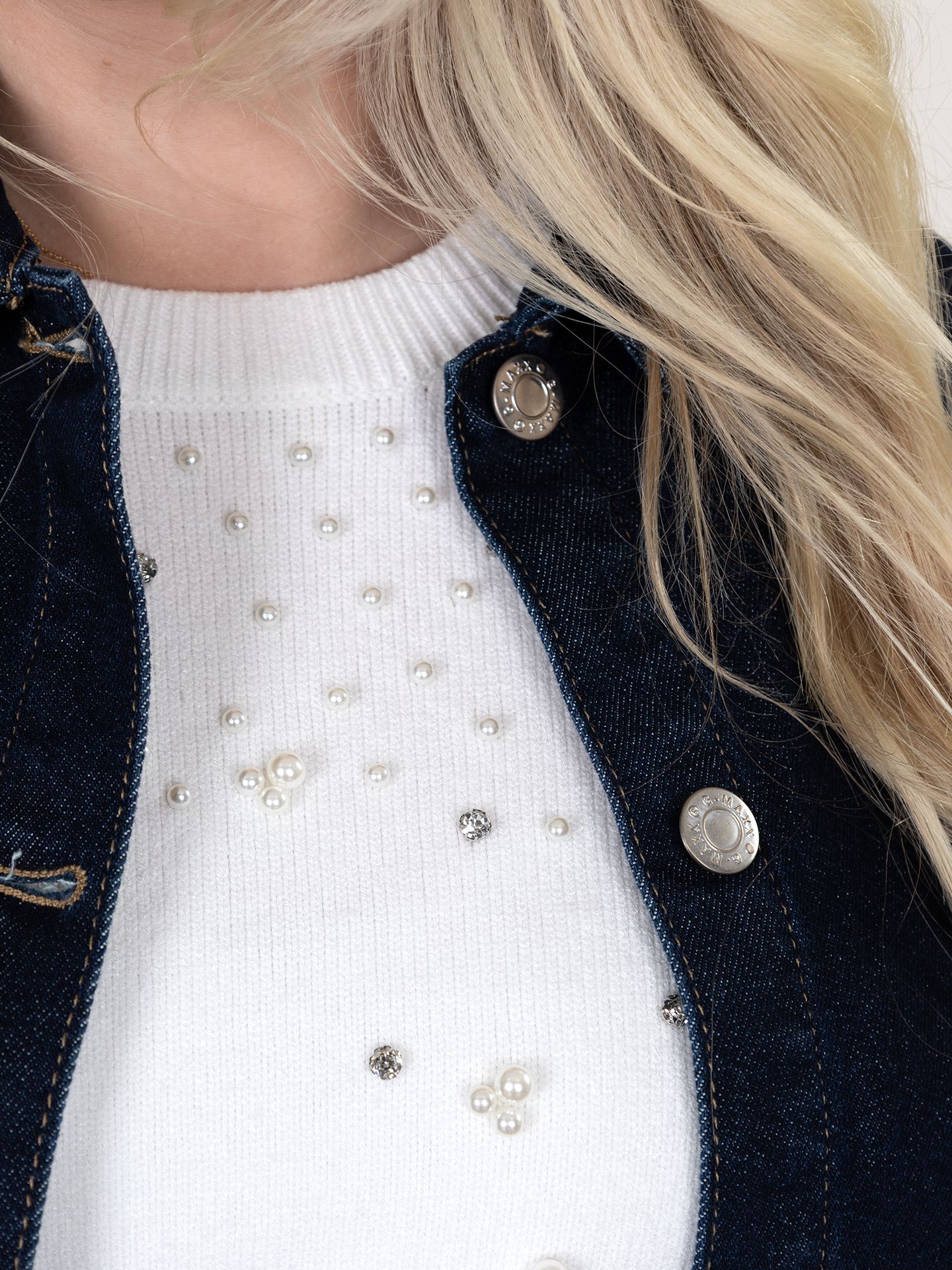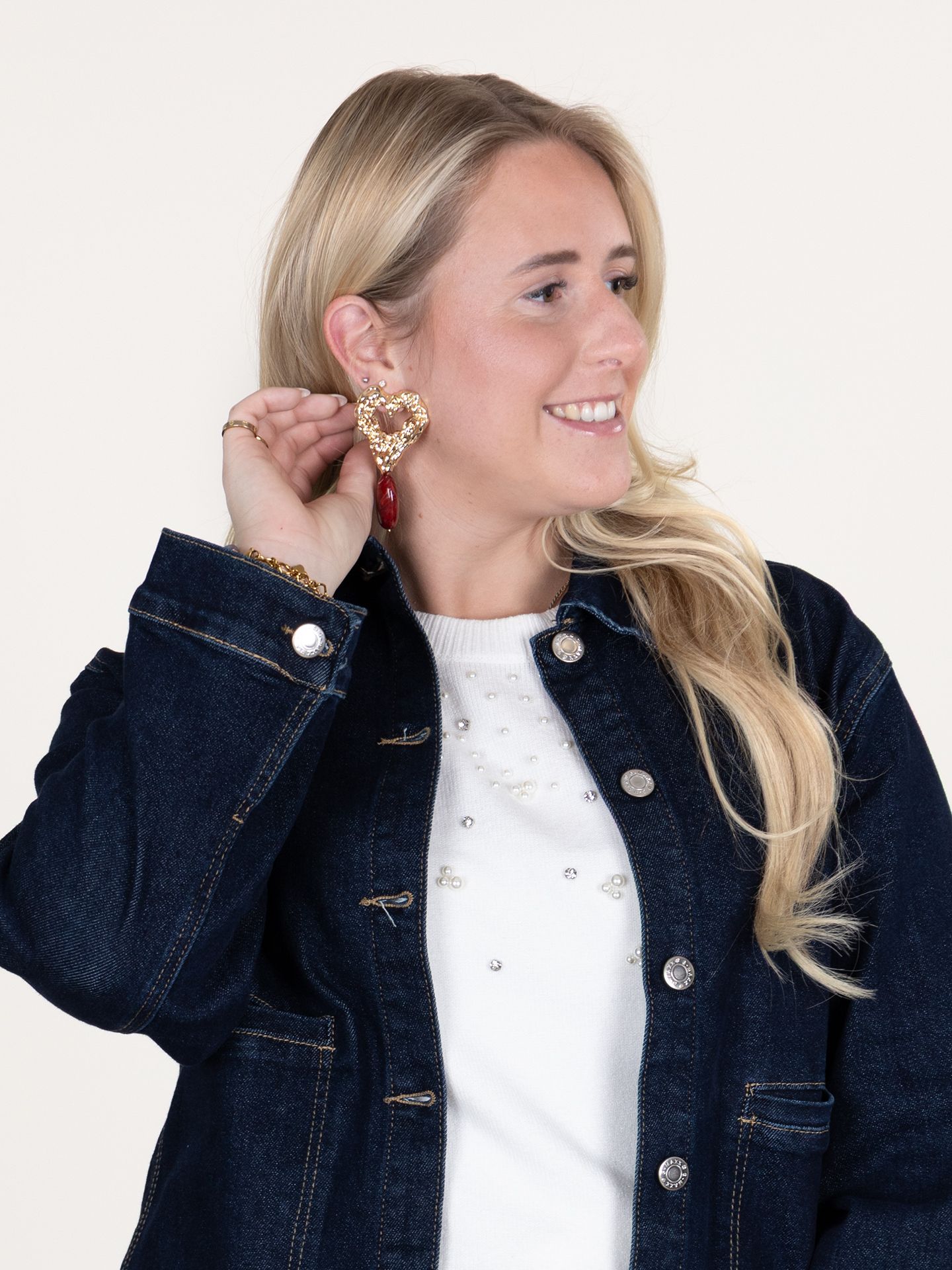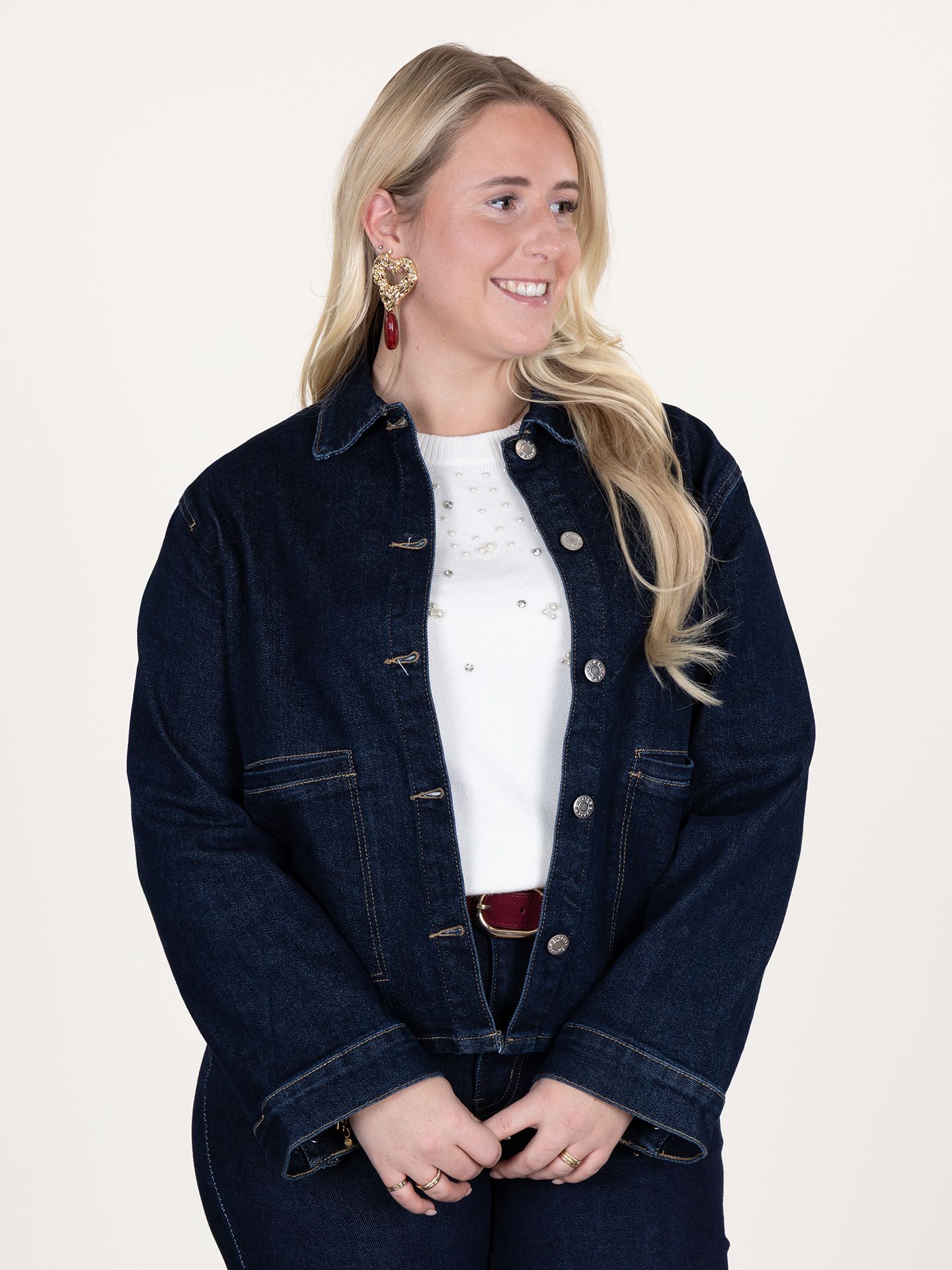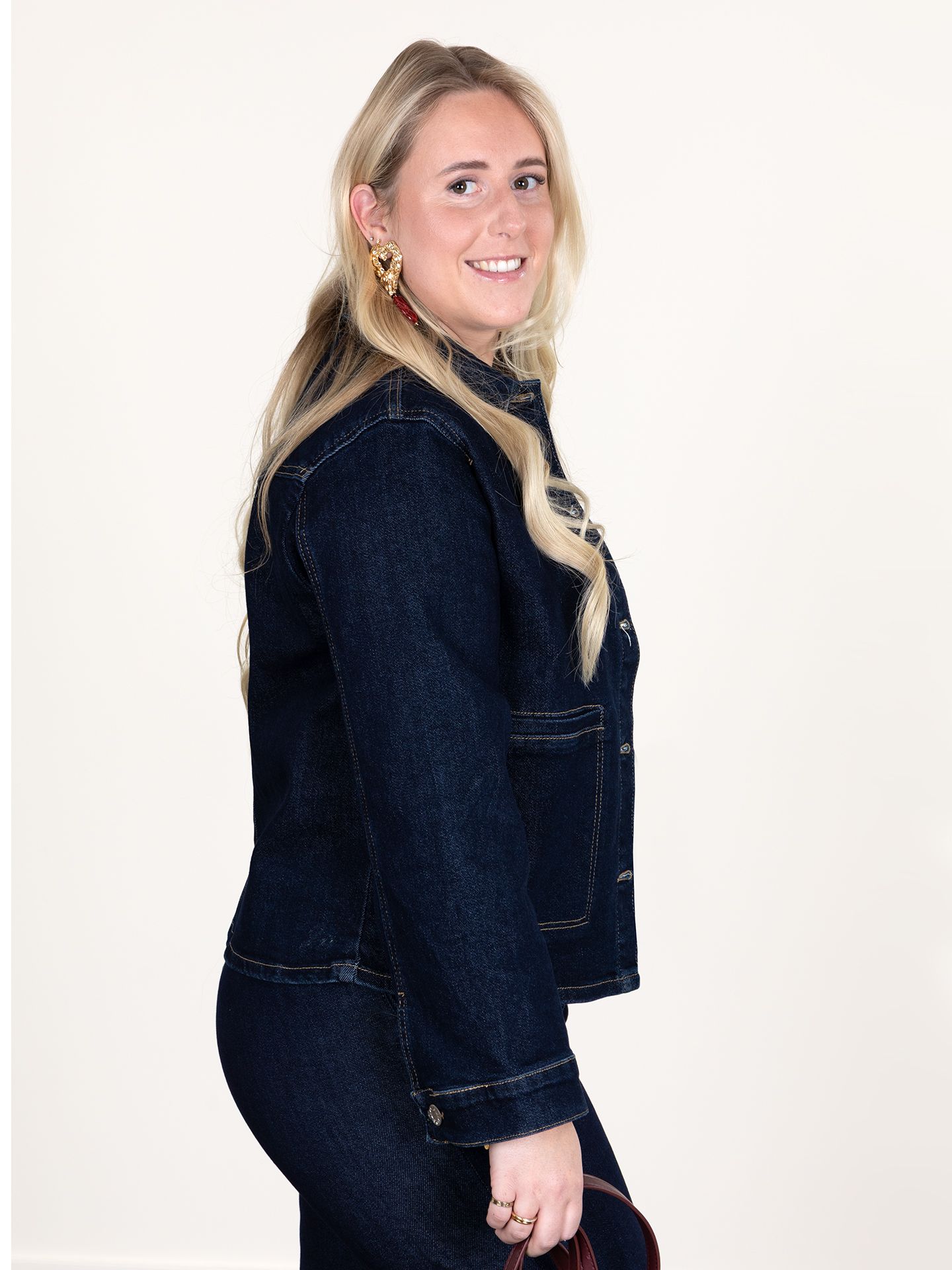 Dana is 1,67 m. zij draagt de jeans in maat L, de top in maat M en het jack in maat S.