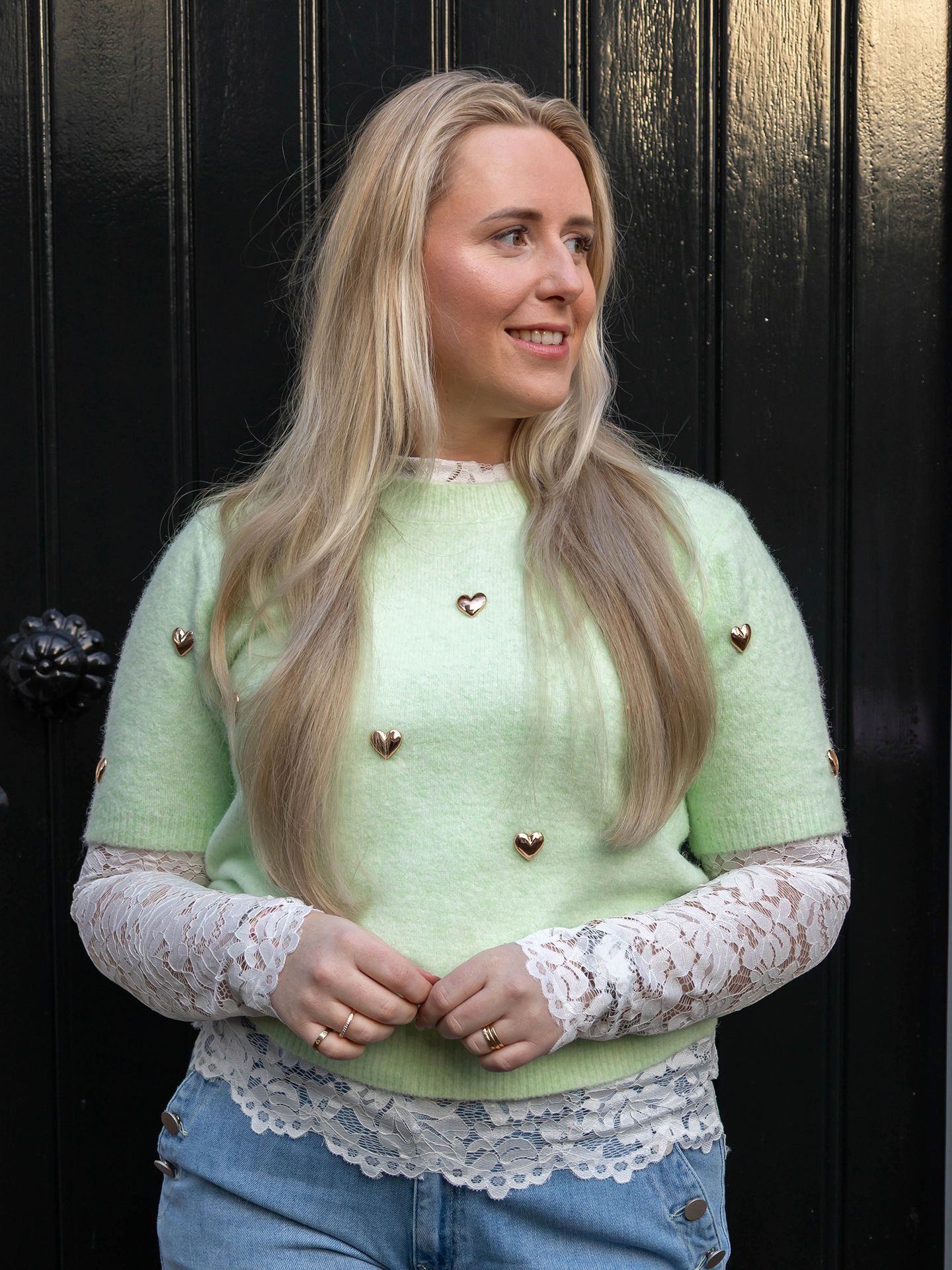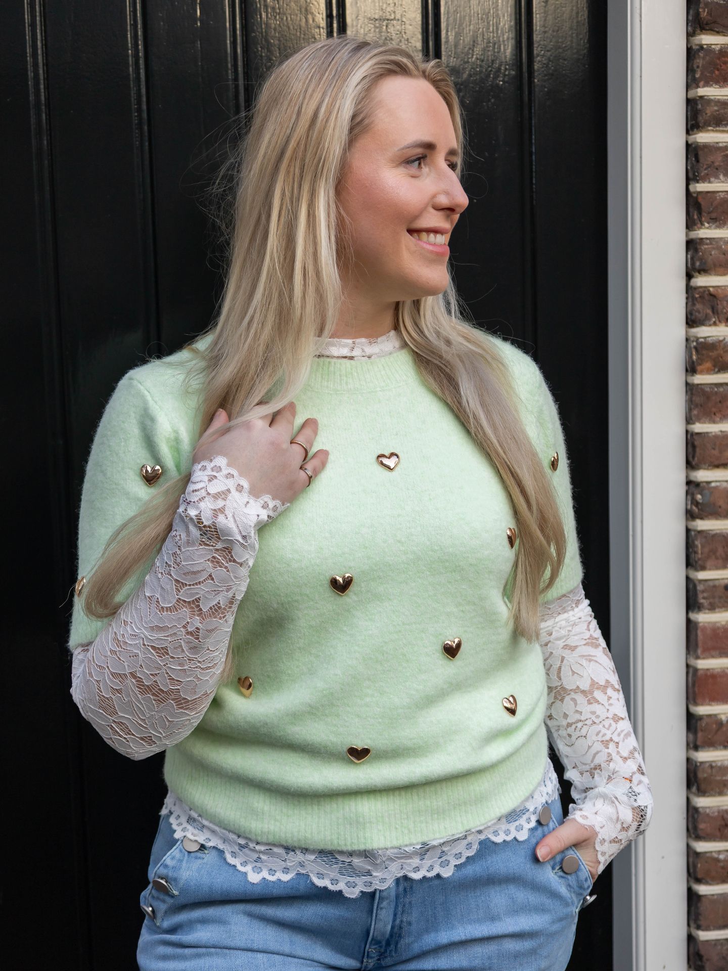 Dana is 1,67 m. zij draagt de broek in maat 40-32, de top in maat M en de trui is one size.