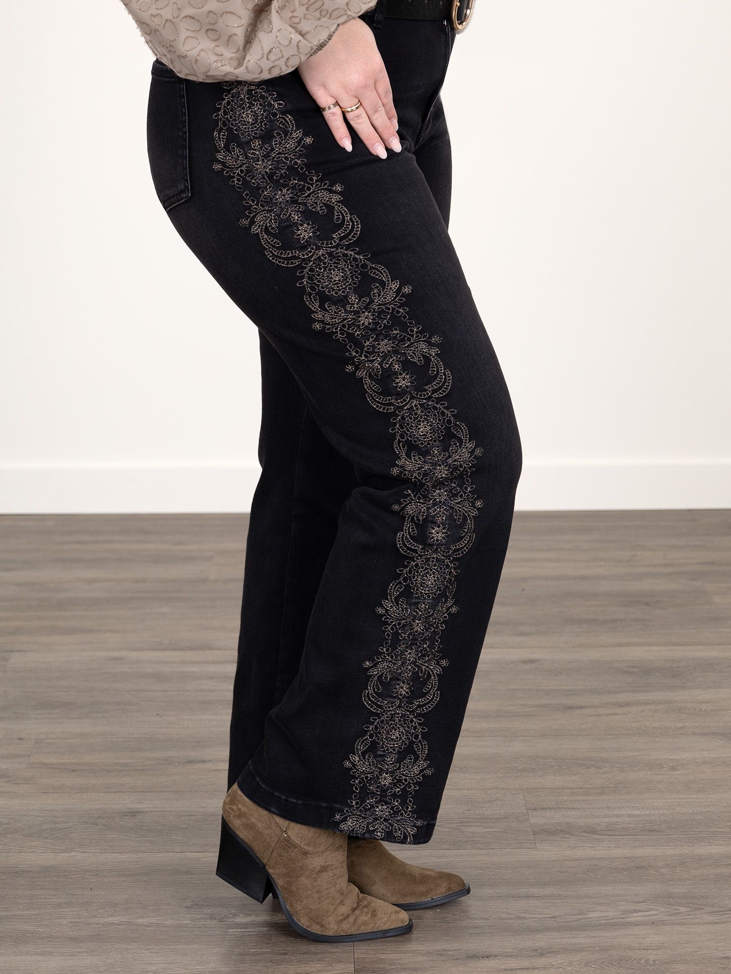 Dana is 1,67 m. zij draagt de jeans in maat 42 en de blouse in 38.