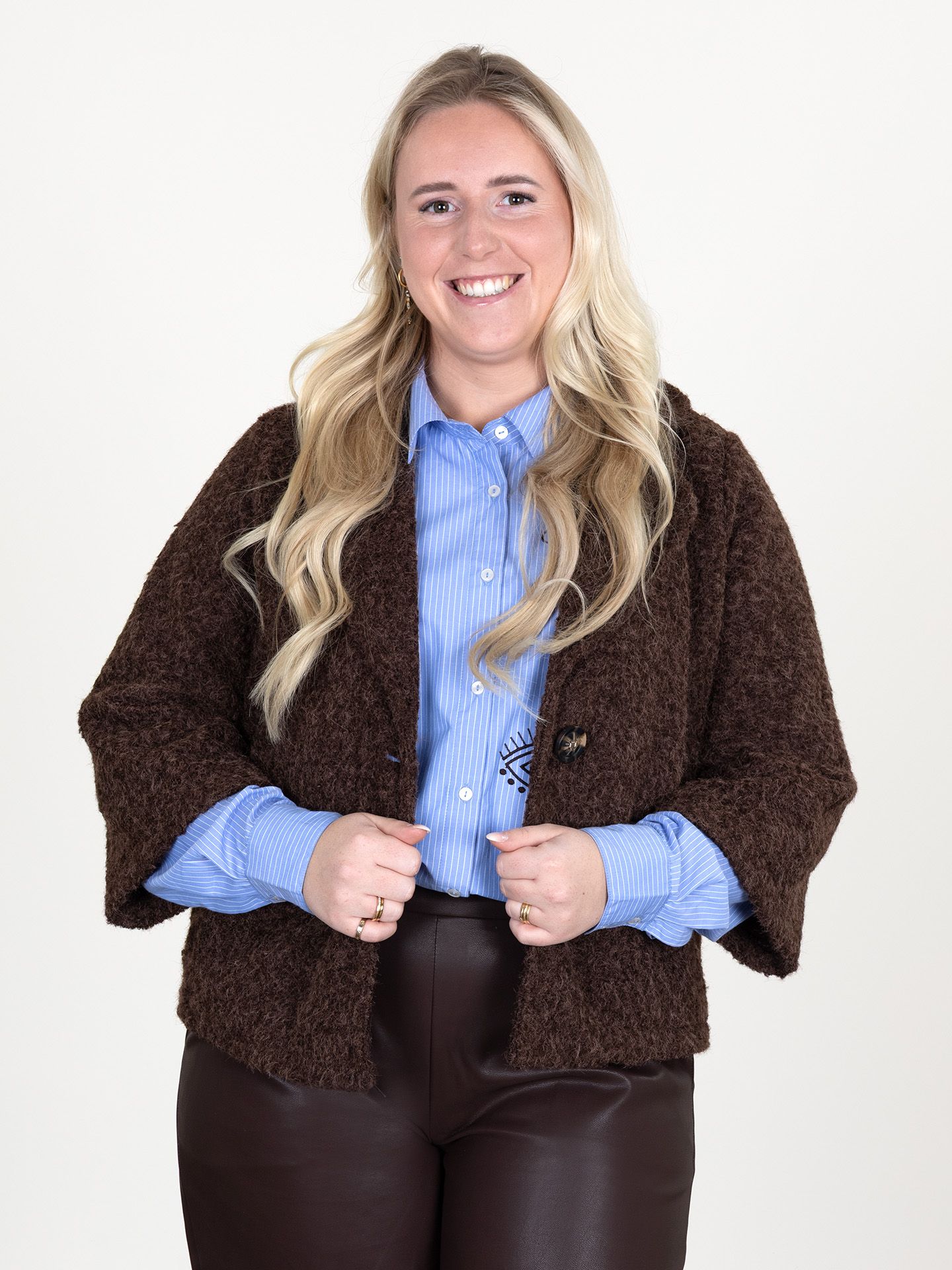 Dana is 1,67 m. zij draagt het jack in maat S/M, de blouse in maat M en de broek in maat L.