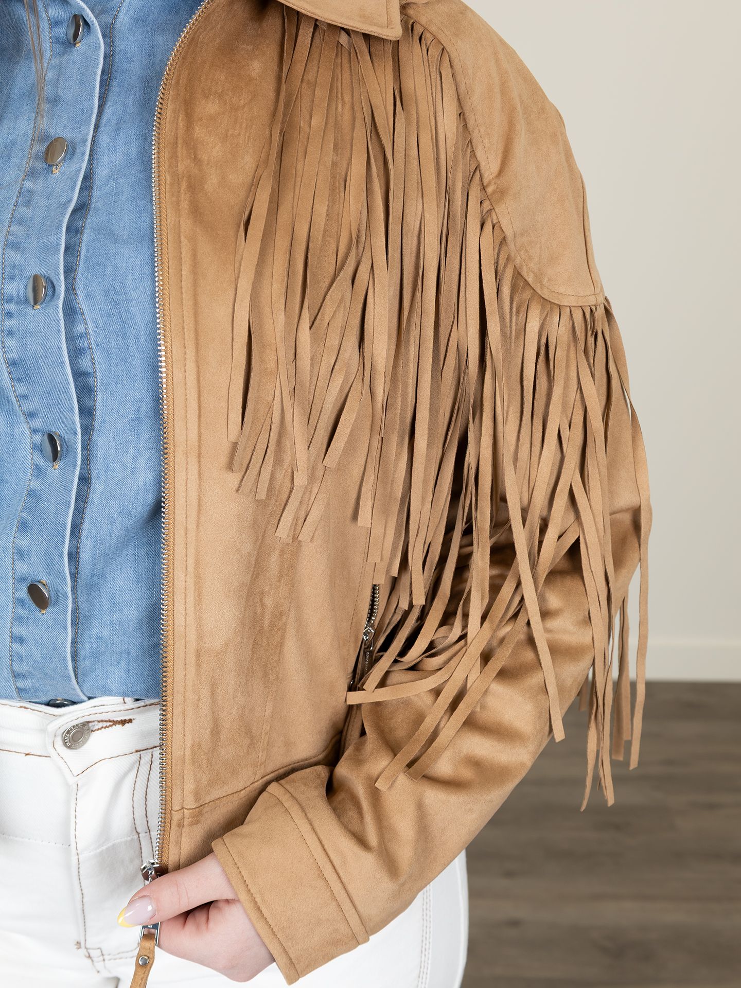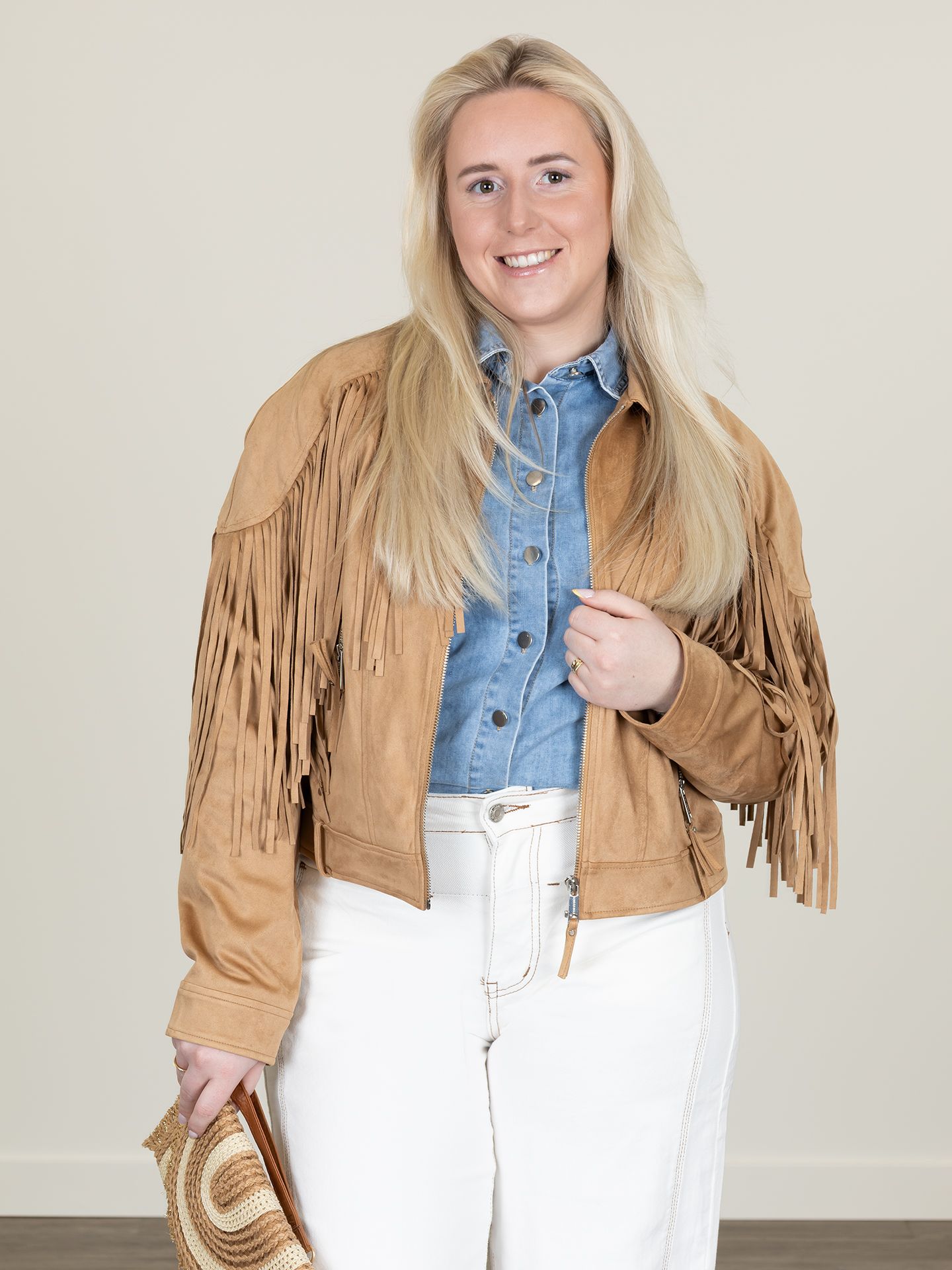 Dana is 1,67 m. zij draagt de blouse in maat L, de jeans in maat 42 en de blazer in maat 40.