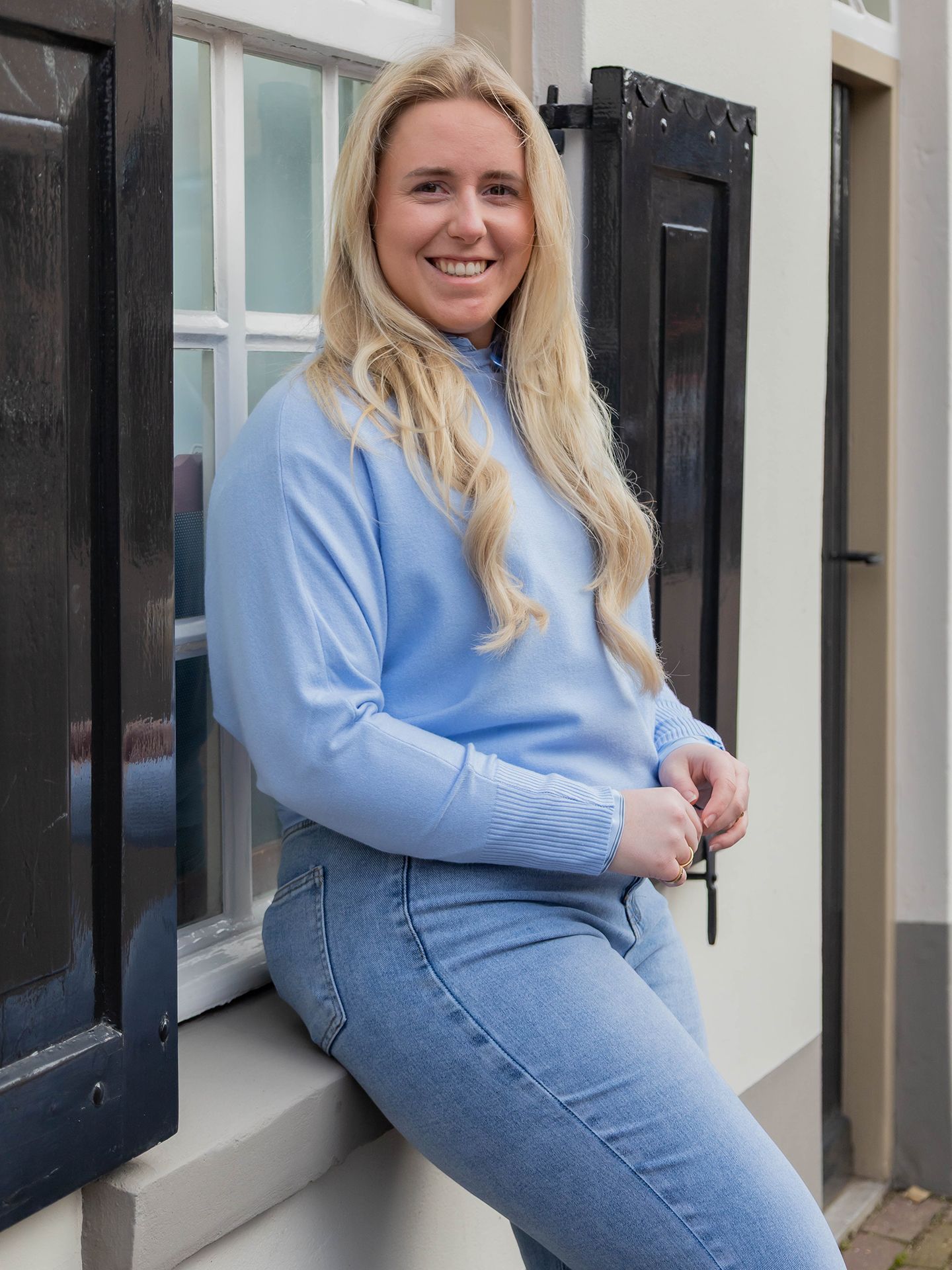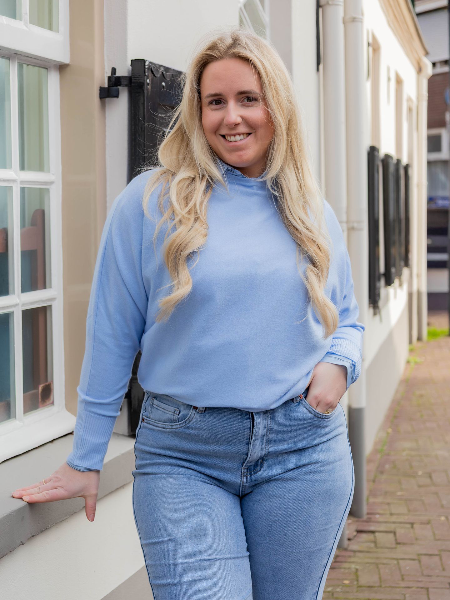 Dana is 1,67 m. zij draagt de jeans in maat 40, de blouse in maat M en de trui in maat XS/S.