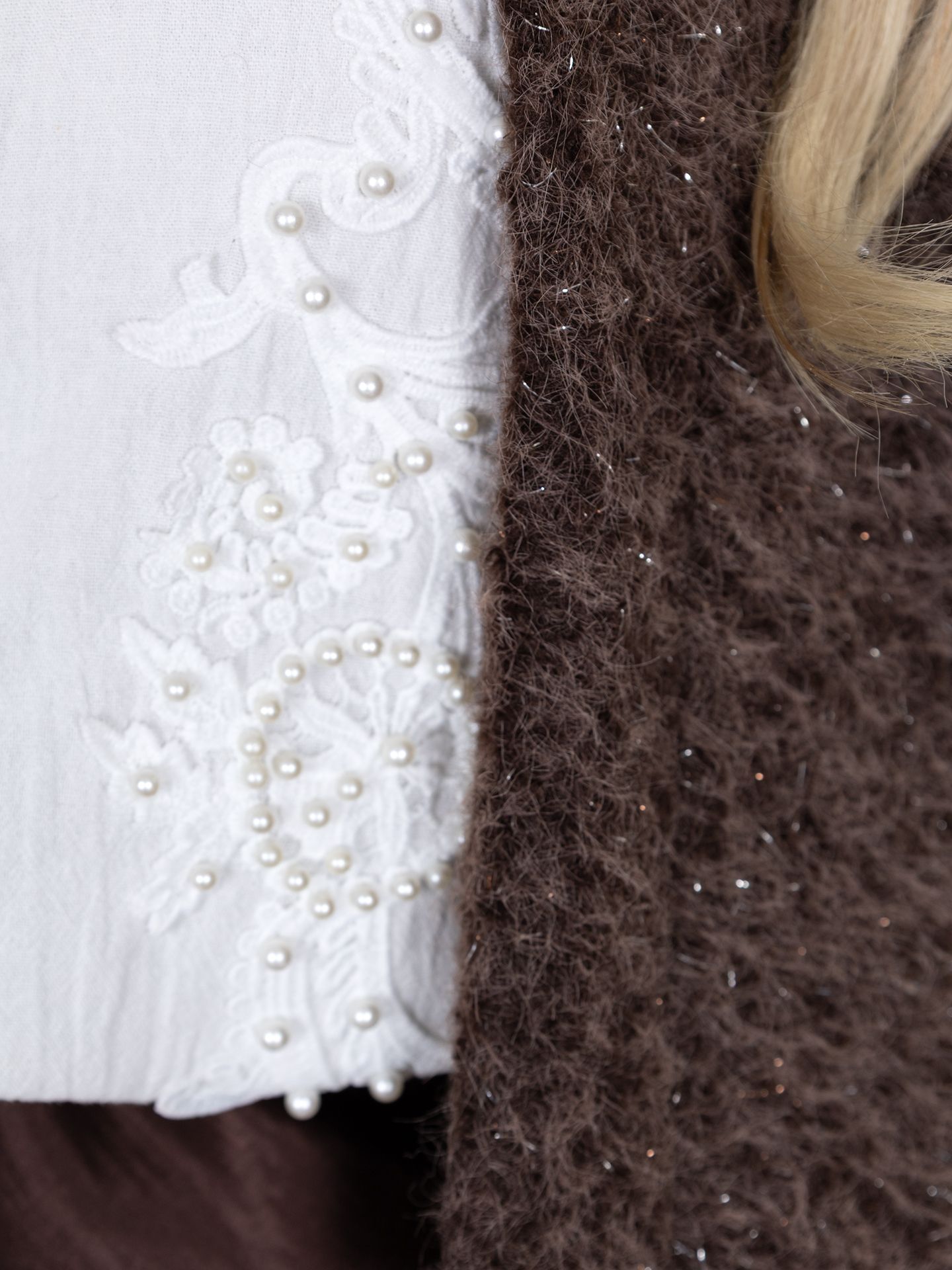 Dana is 1,67 m. zij draagt het gilet in maat S/M, de blouse in maat M/L en de rok in maat L.