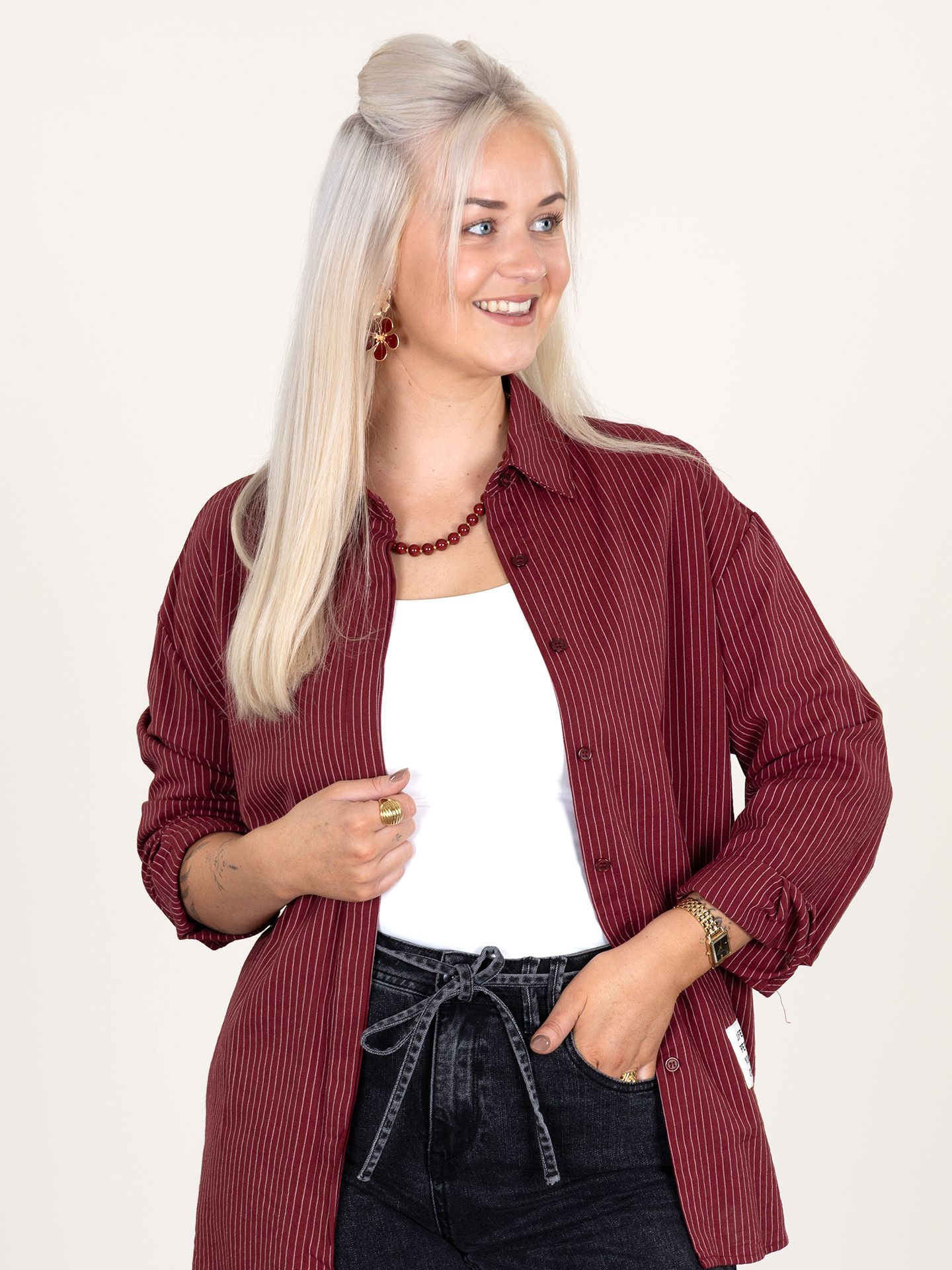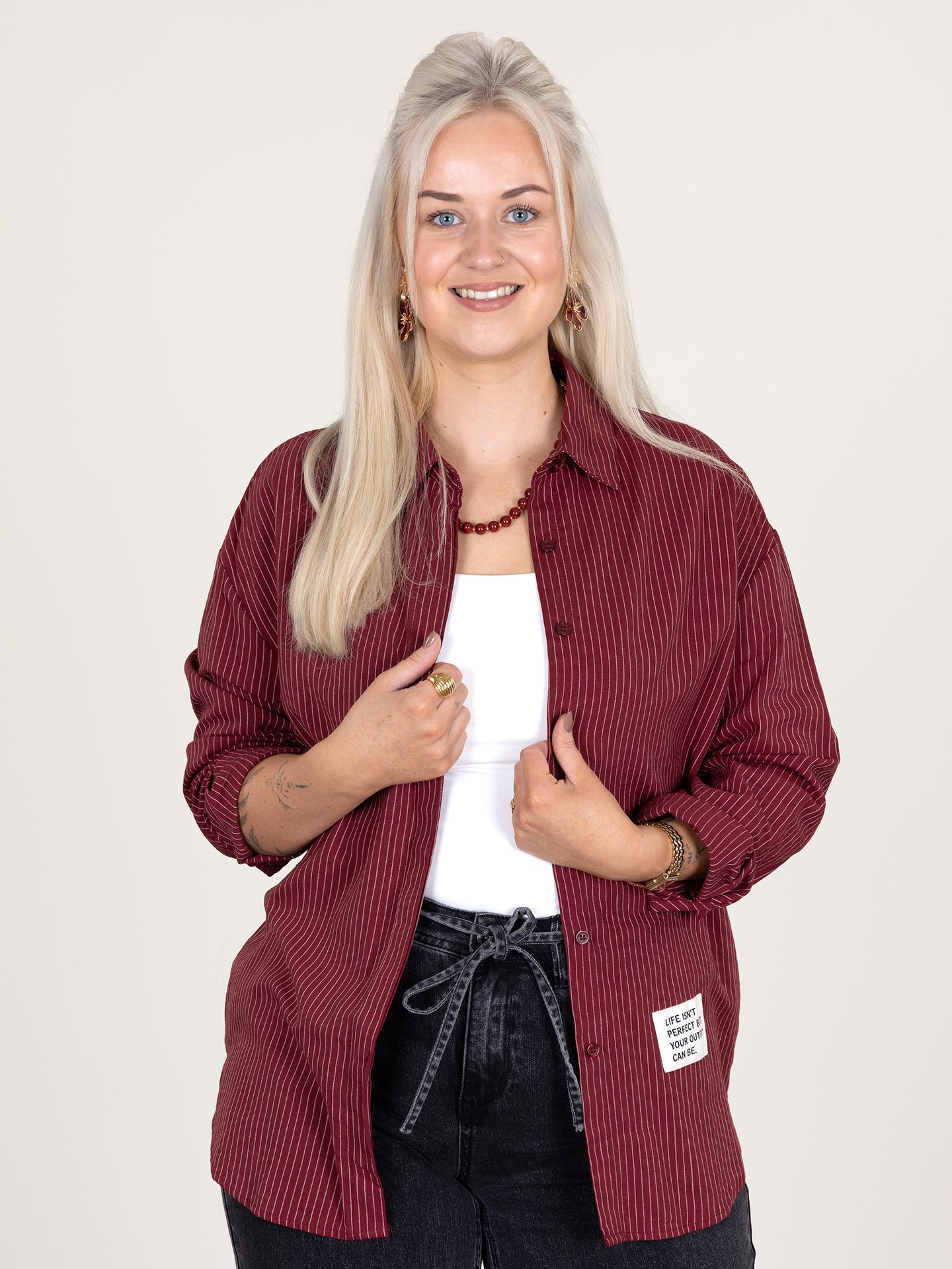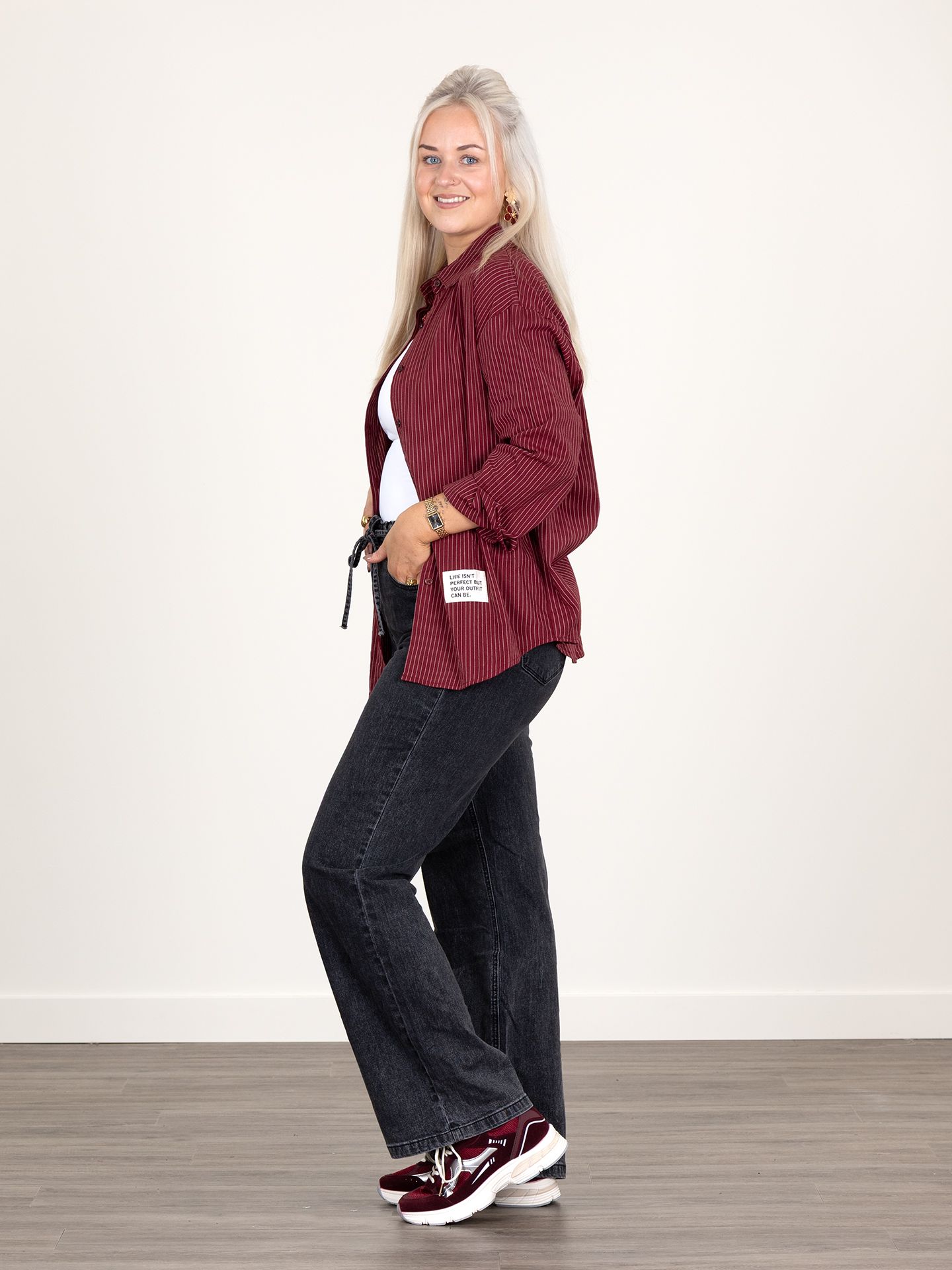 Daphne is 1,73 m. zij draagt het t-shirt in maat S, de jeans in maat 38/33 en de blouse is one size.