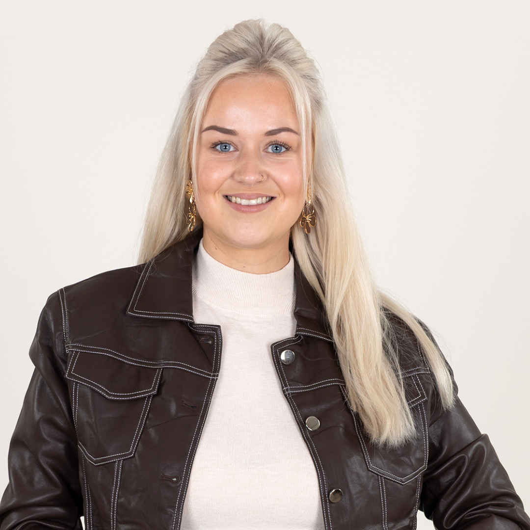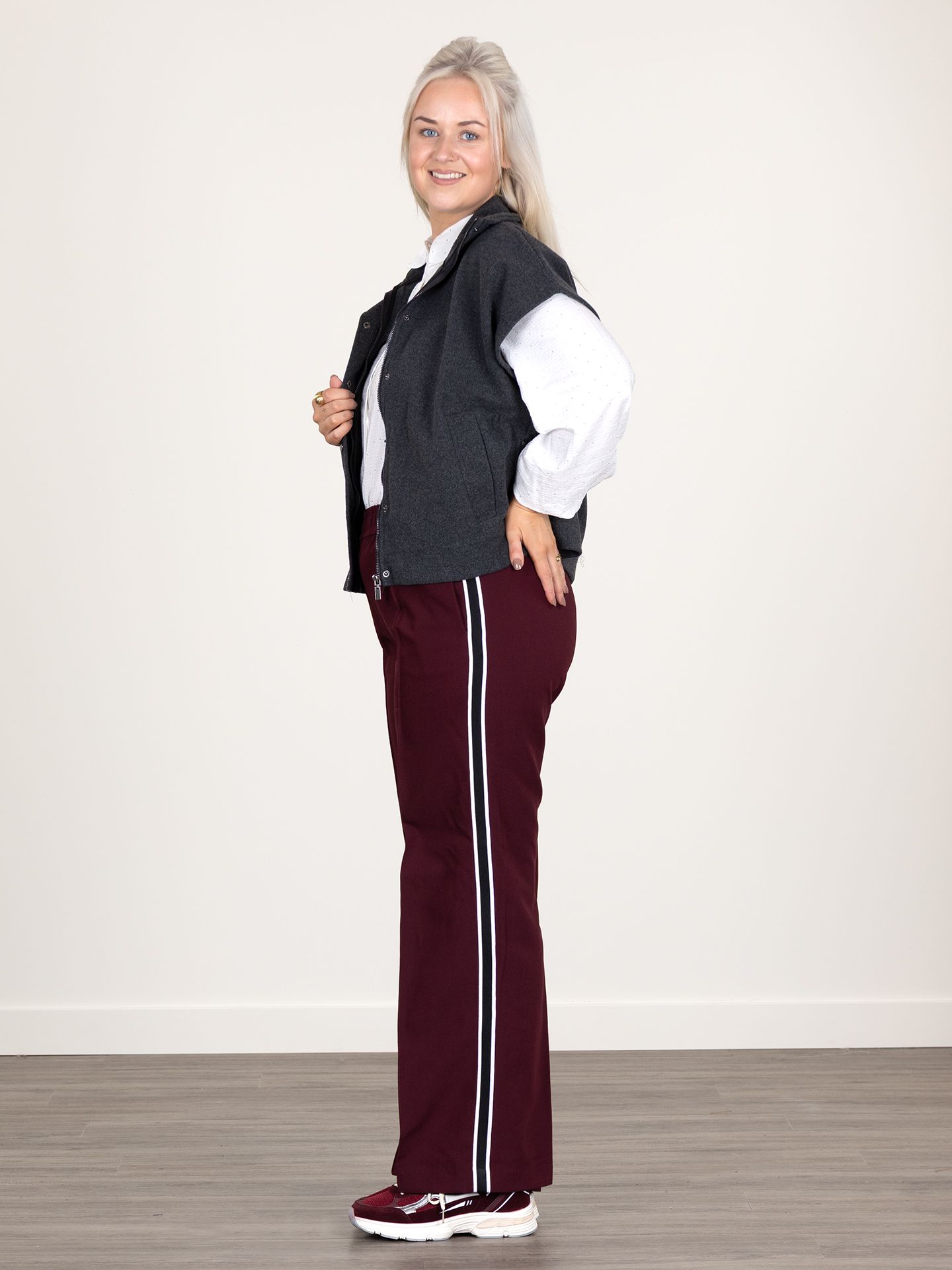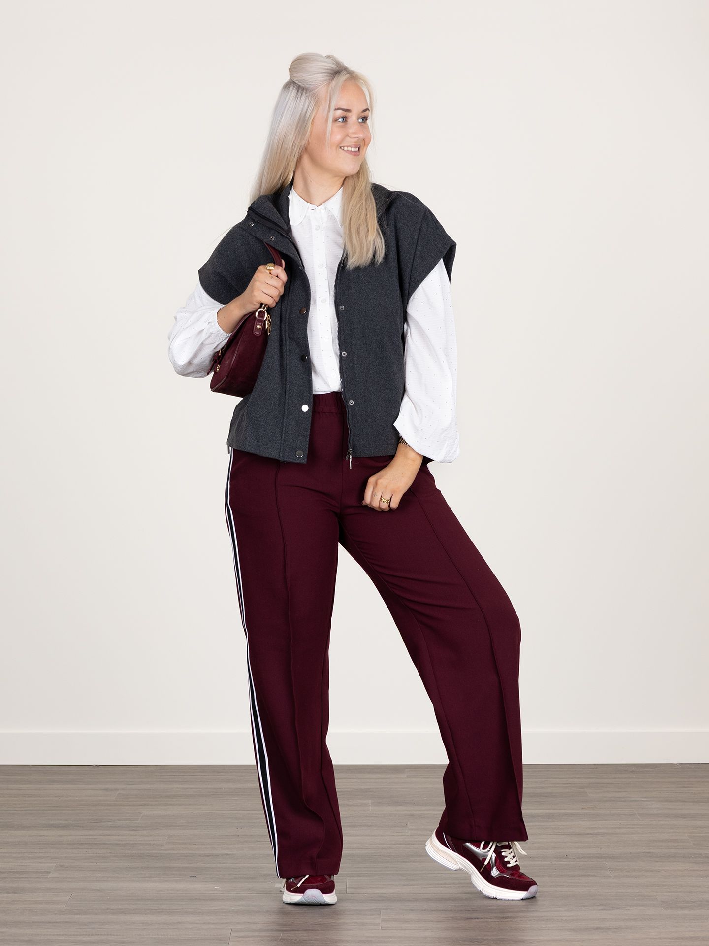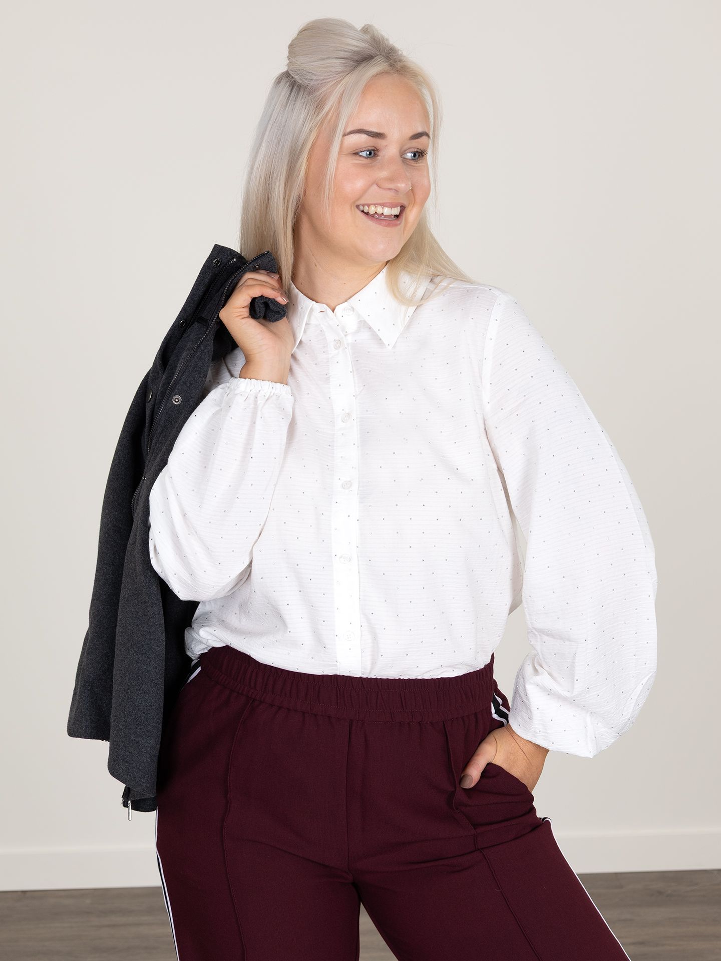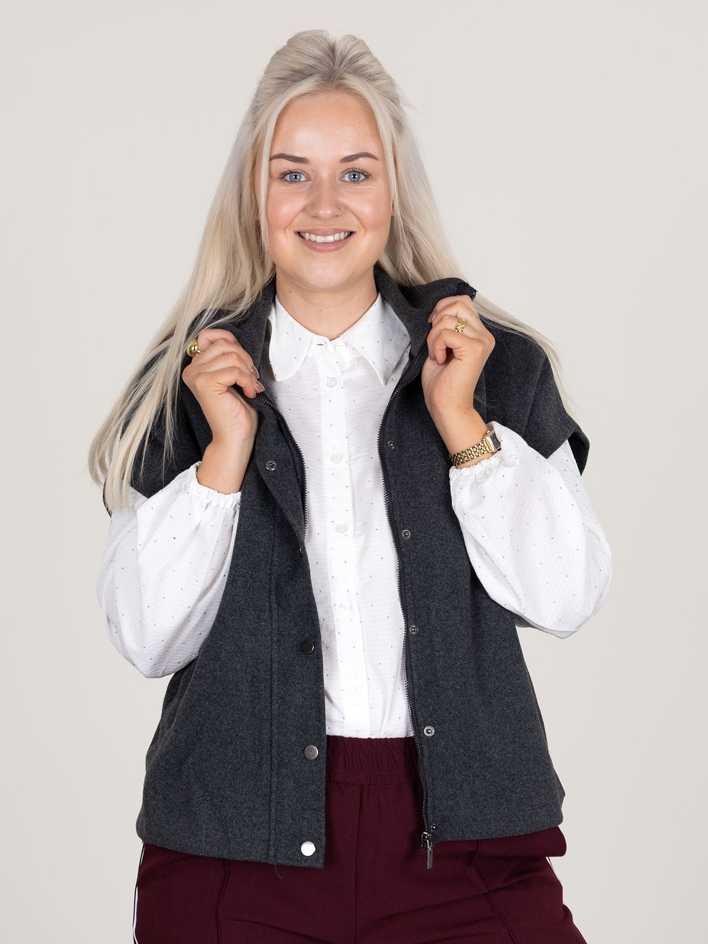 Daphne is 1,73 m. zij draagt de jeans in maat L, de blouse en blazer in maat M.