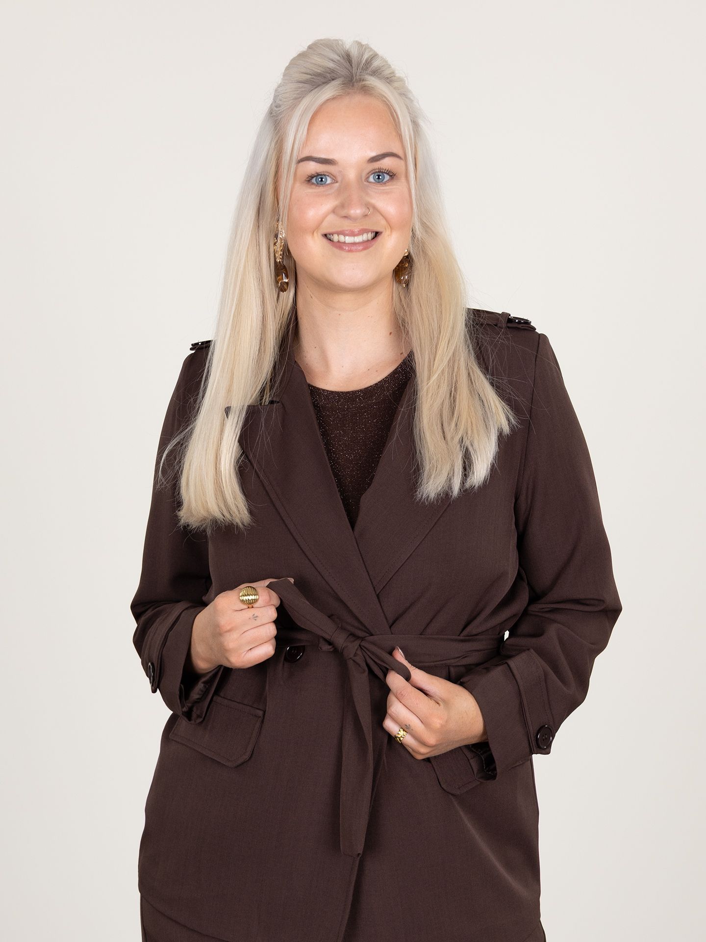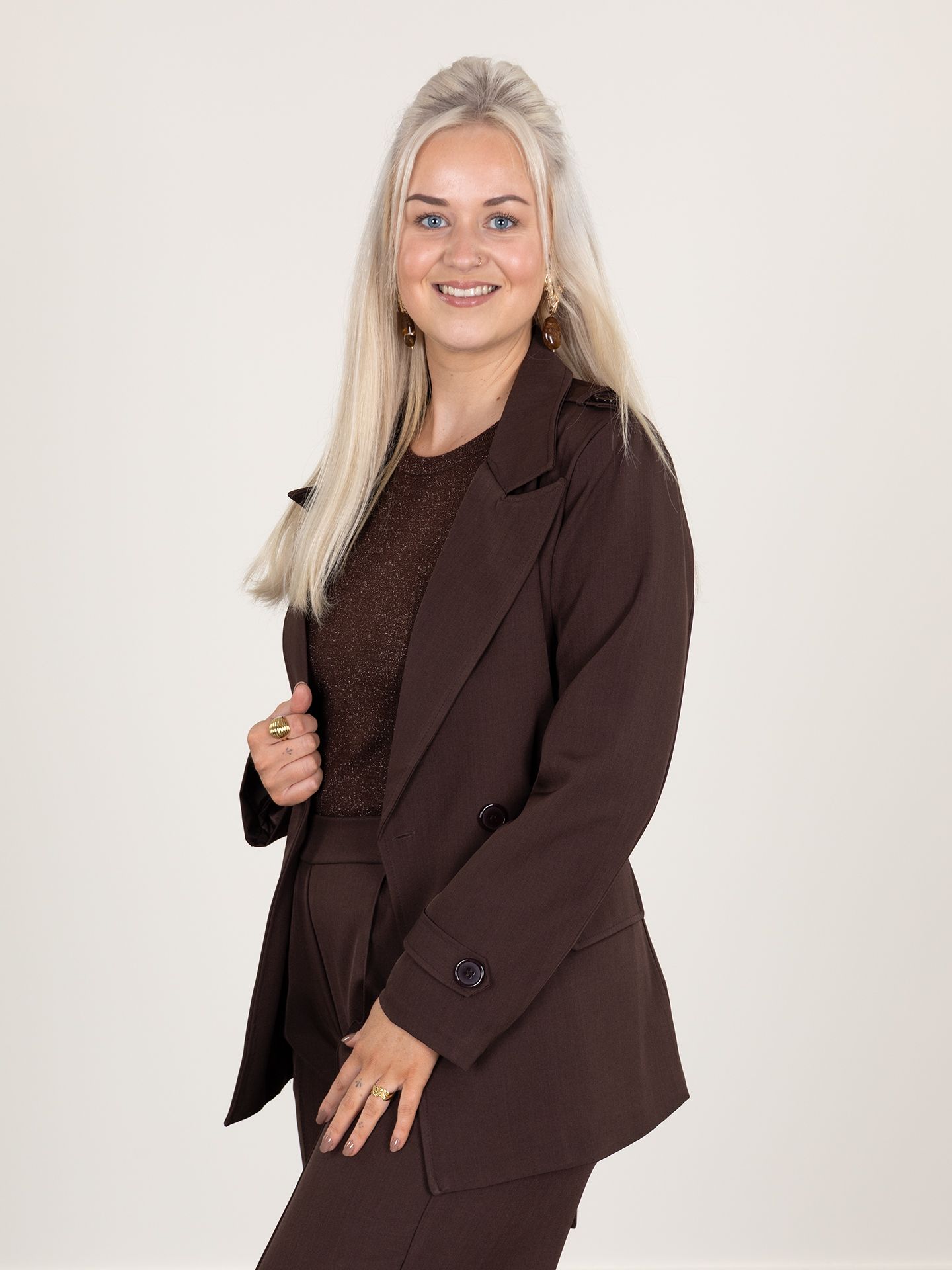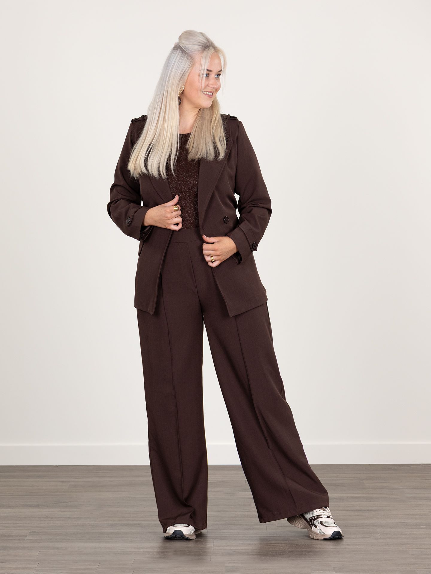 Daphne is 1,73 m. zij draagt het t-shirt in maat S/M, de broek in maat L en de blazer in maat M.