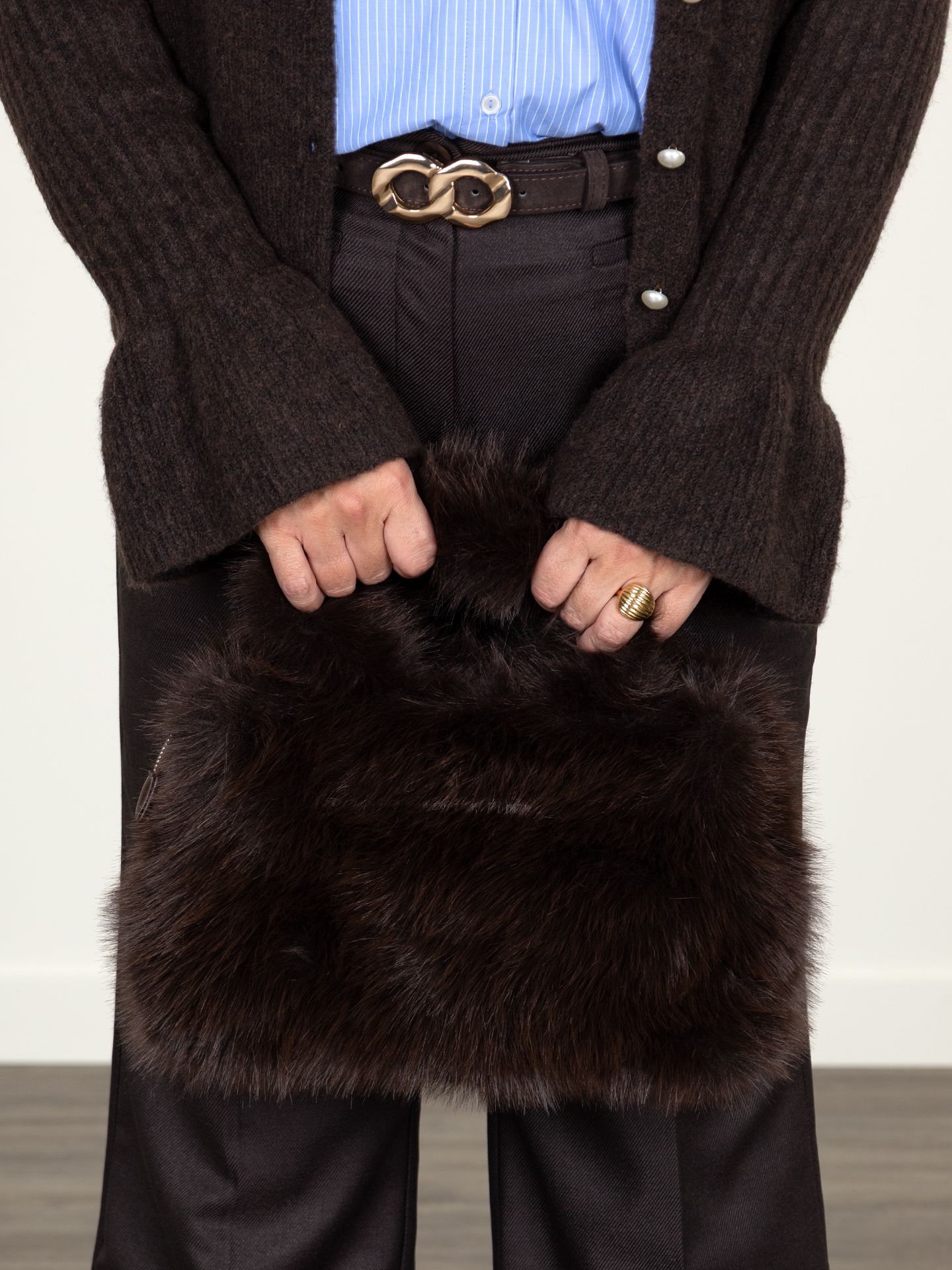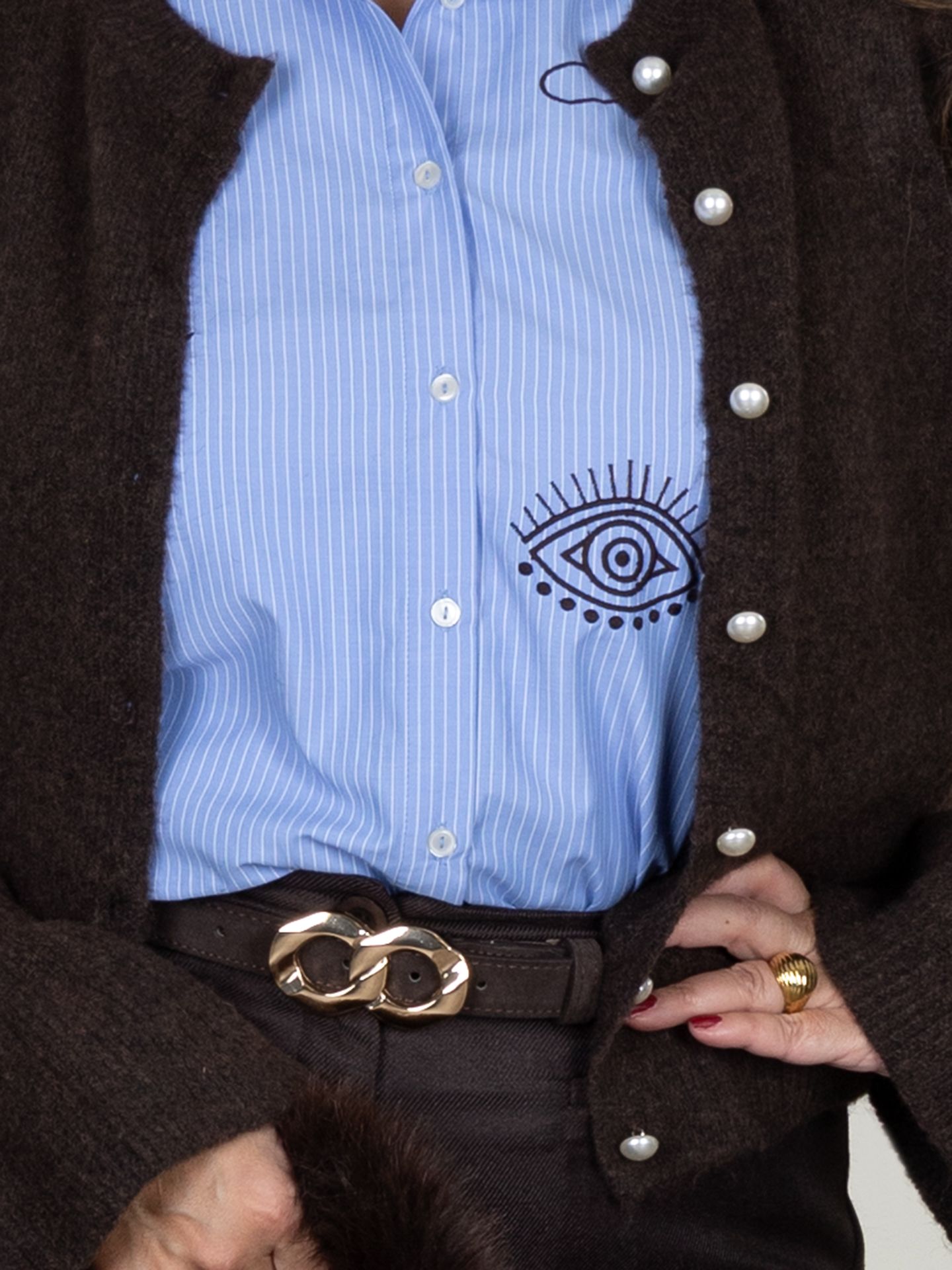 Debby is 1,67 m. zij draagt de broek in maat L, de blouse in maat M en het vest is one size.