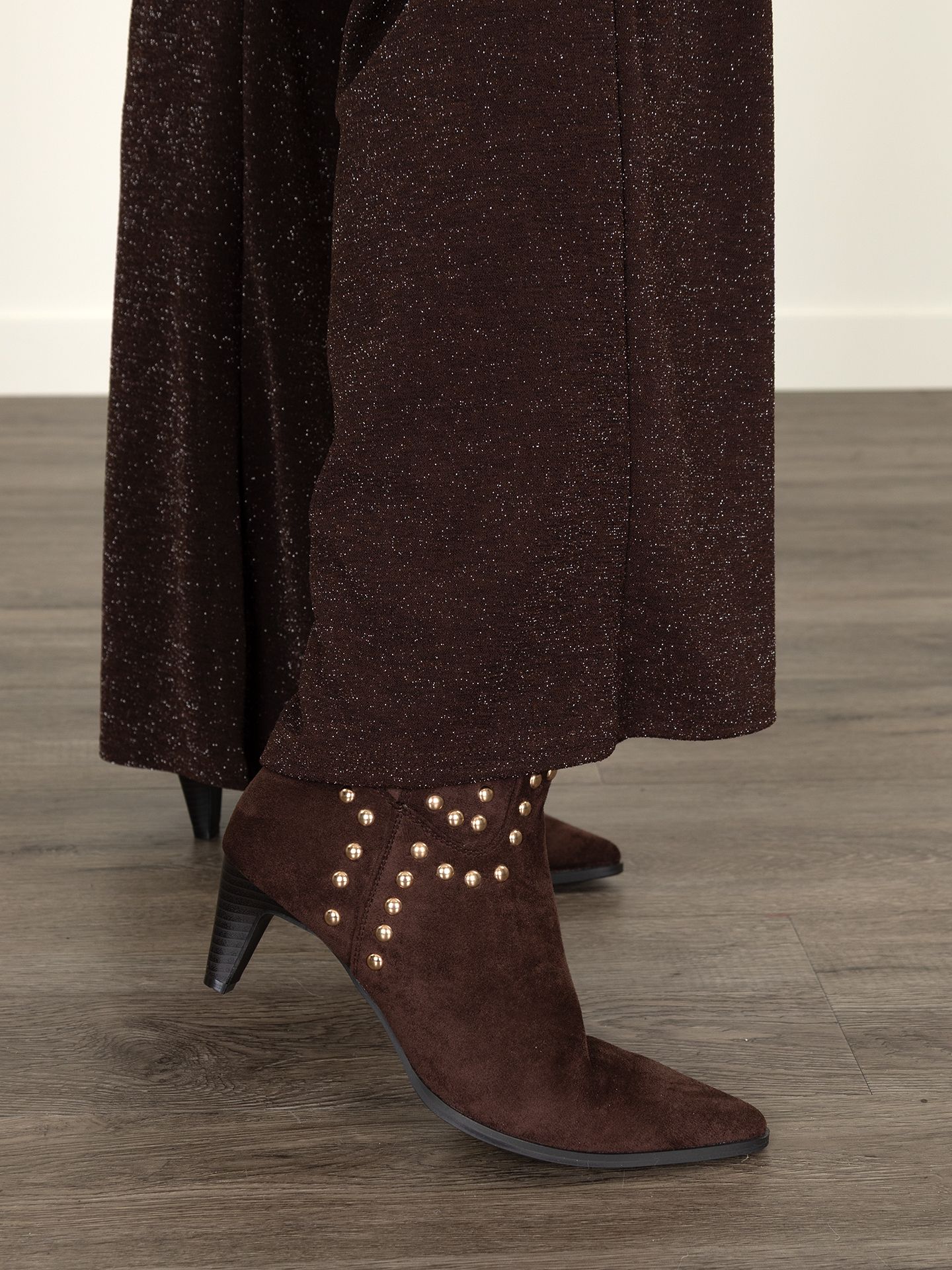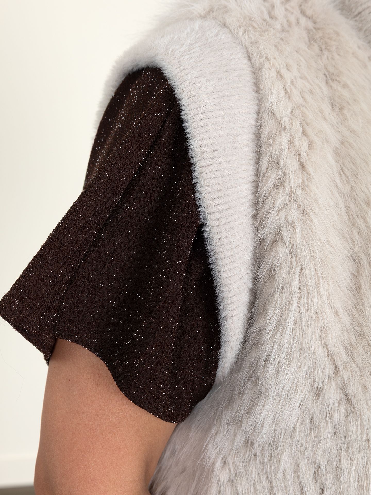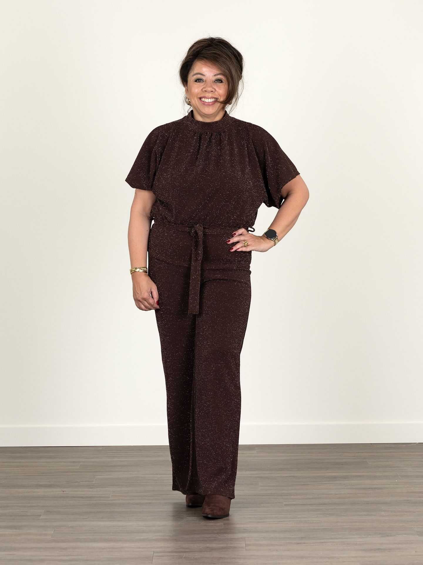 Debby is 1,67 m. zij draagt het vest in maat 40, het t-shirt in maat L en de broek in maat M.
