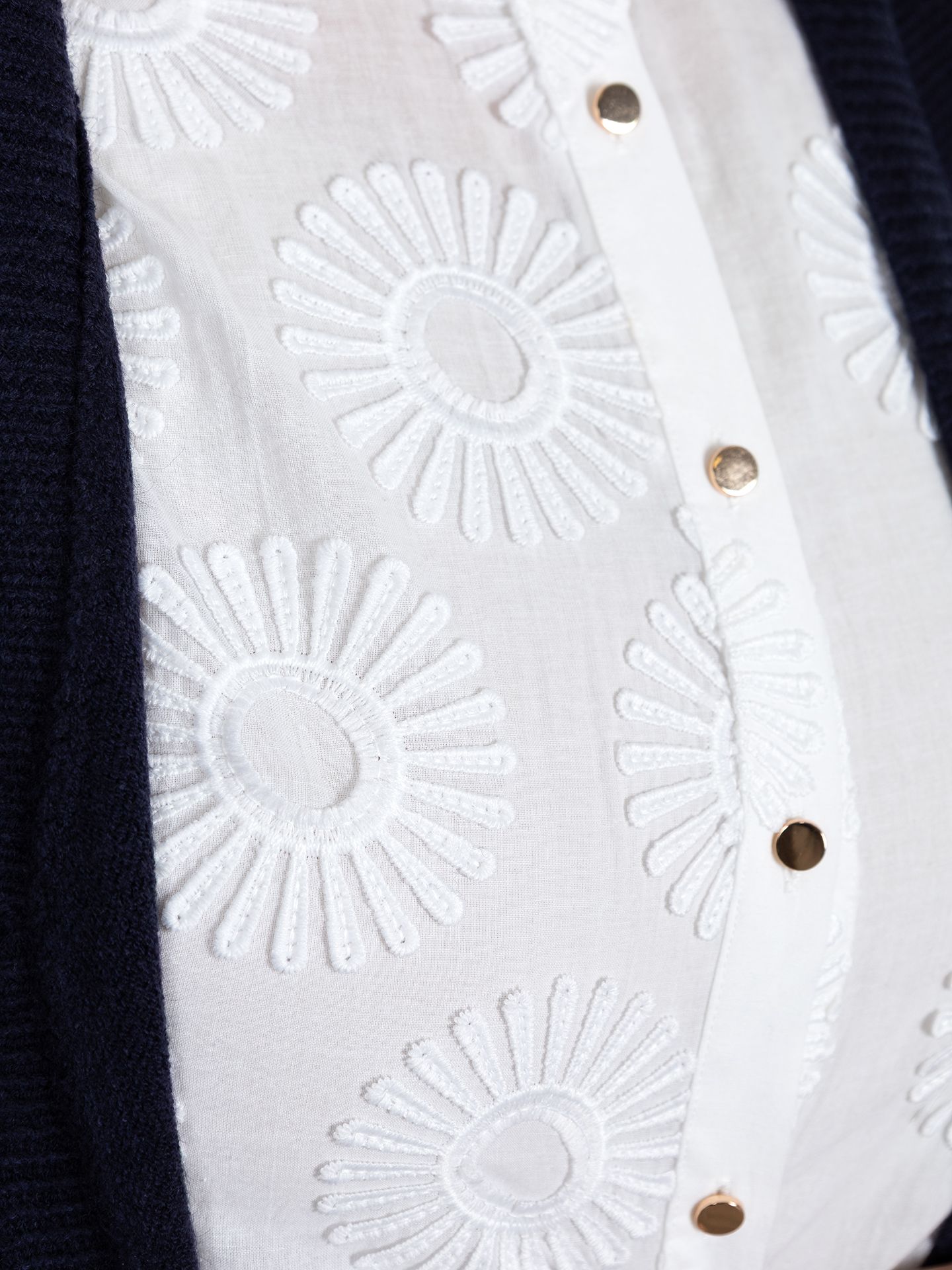 Debby is 1,67 m. zij draagt het vest in maat XS/S, de blouse in maat L en de broek in maat M.
