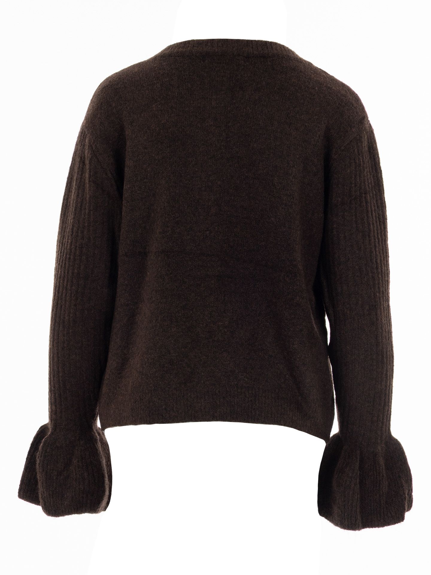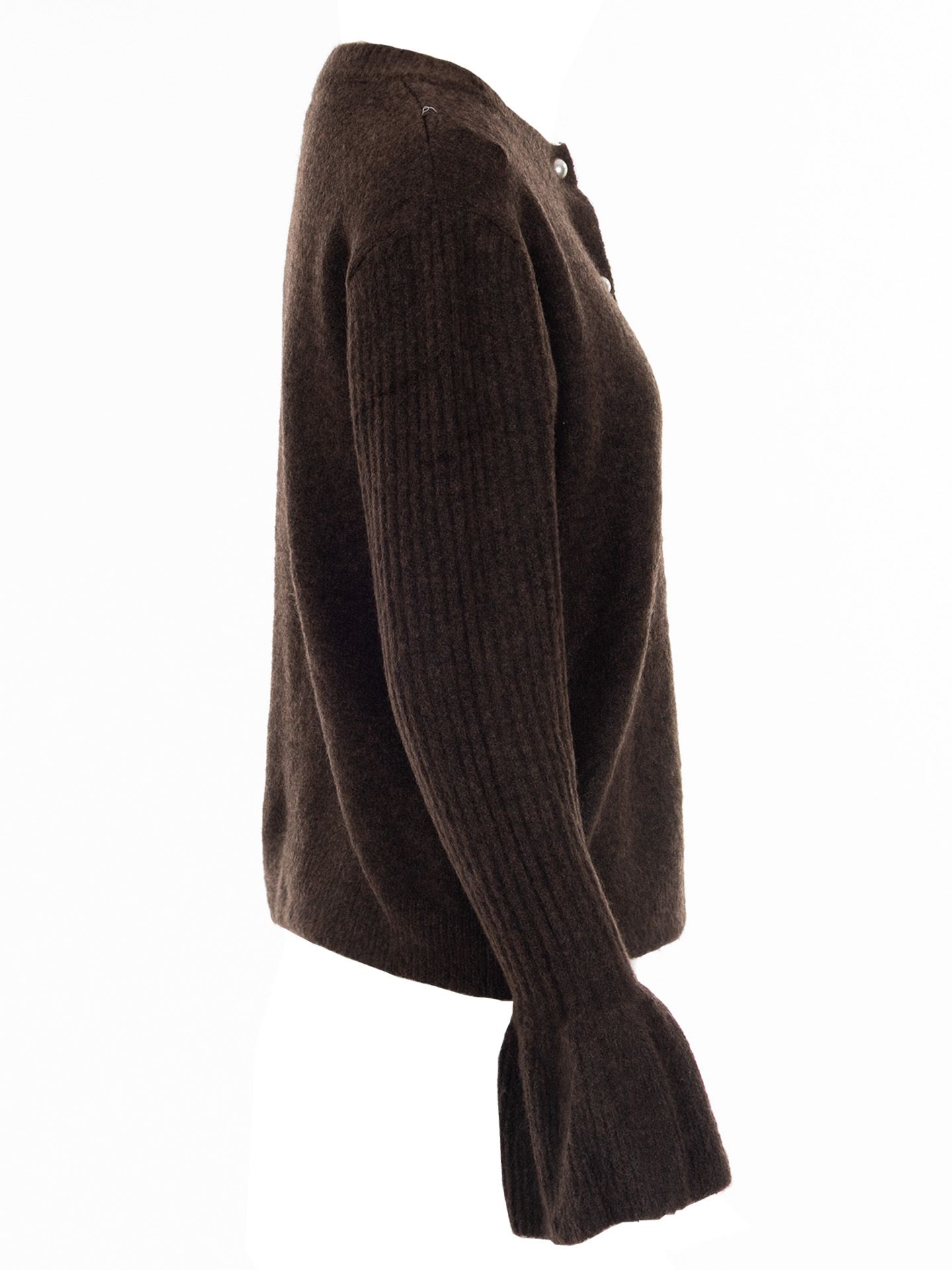 Zachte gebreide cardigan met een ronde hals en een rij sierlijke knopen aan de voorzijde. De mouwen hebben een subtiele plooi en een brede geribde boord voor een speels effect. Deze stijlvolle vest is perfect om over een top of blouse te dragen voor een comfortabele, vrouwelijke look.