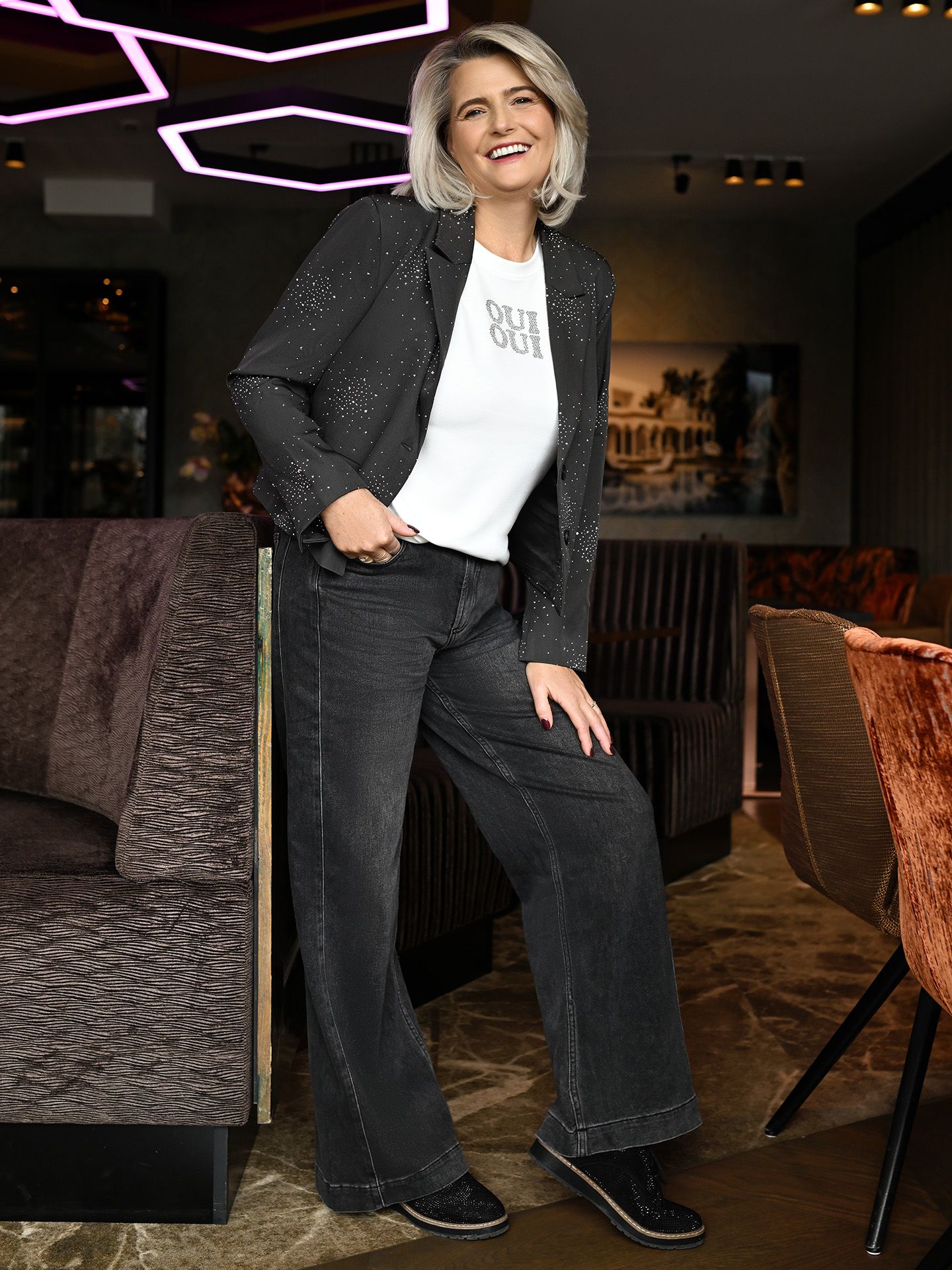 Diane is 1.75 m. het t-shirt draagt zij in maat M, de blazer in L en de jeans in maat 40.