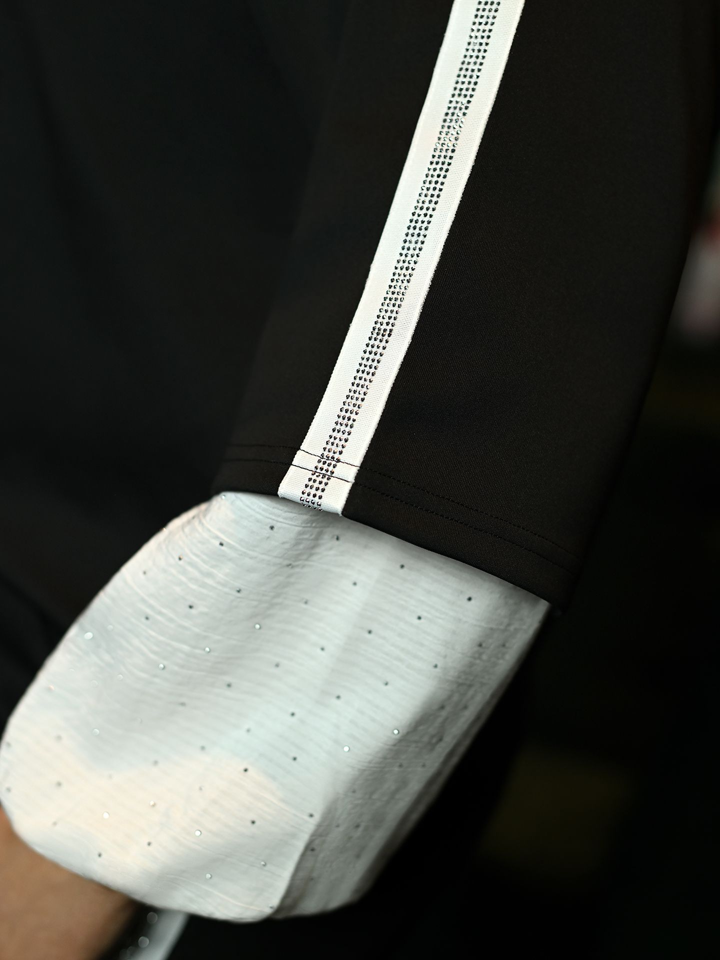 Diane is 1.75 m. zij draagt de trui in maat L, de blouse en broek in maat M.