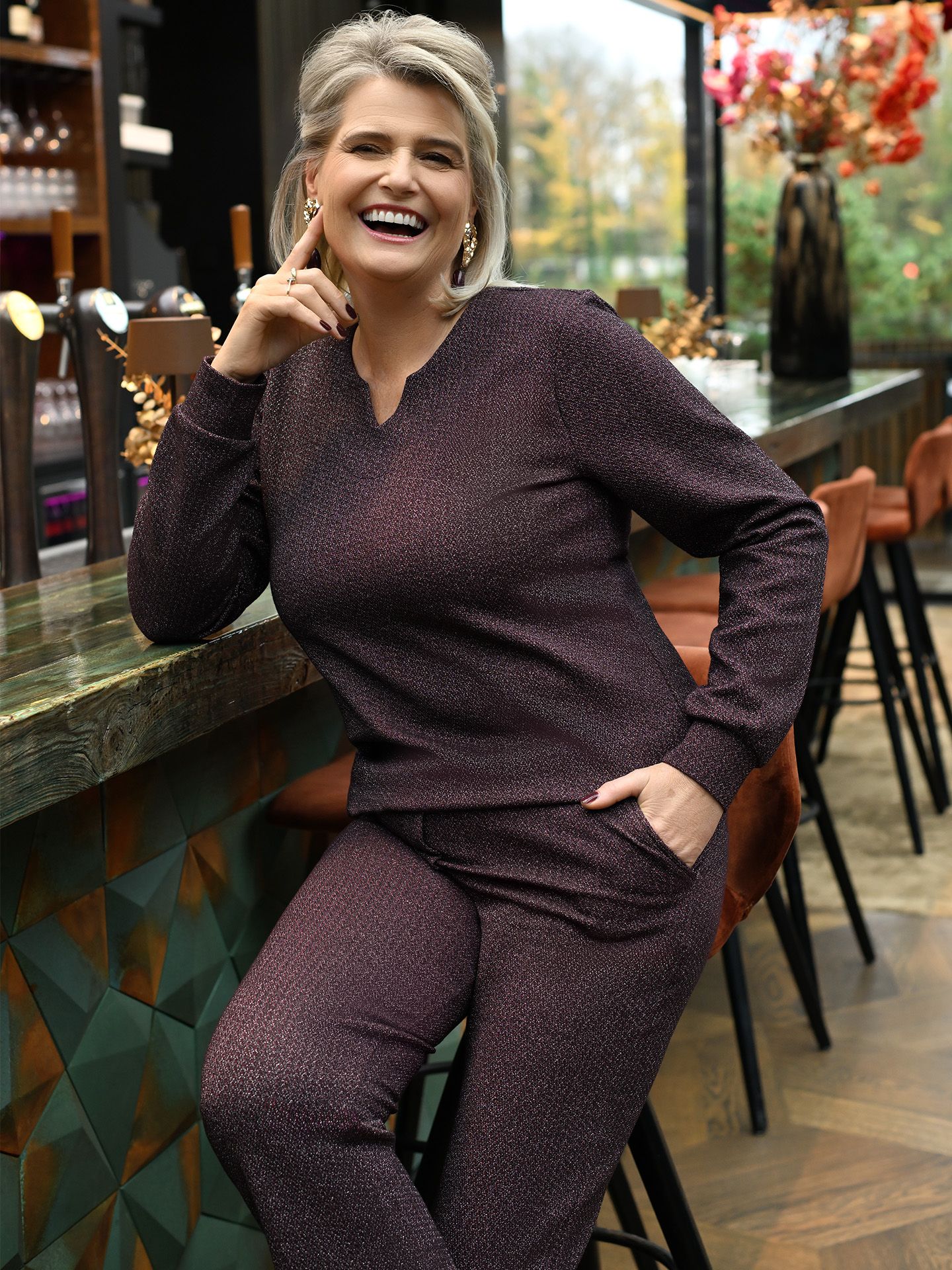 Diane is 1.75 m. zij draagt de broek in maat L en de trui in maat M.