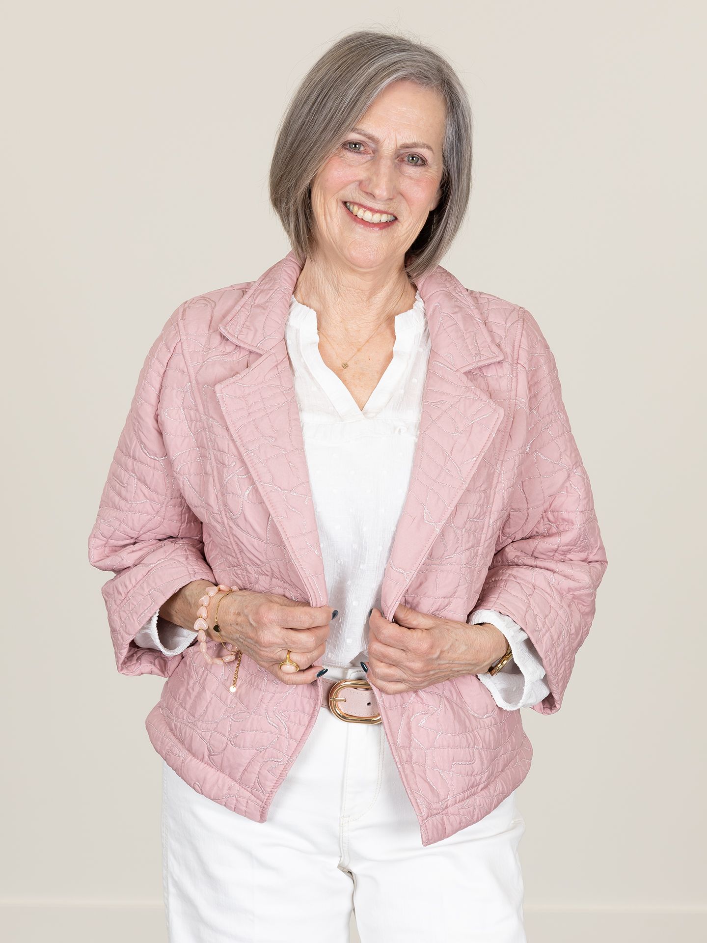 Ellie is 1.62 m. zij draagt de blazer in maat S, de blouse in maat 36 en de broek in maat 38/26.