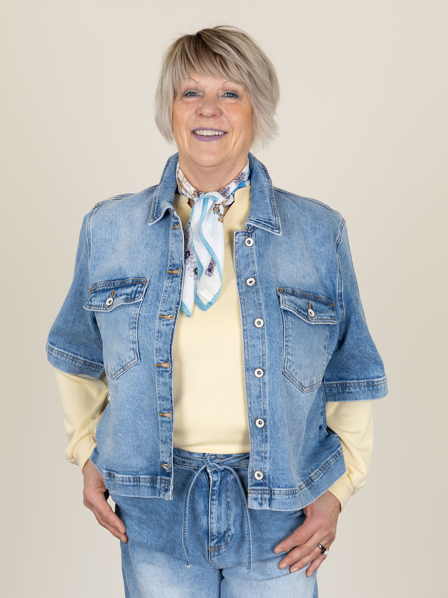 Els is 1.73 m. zij draagt de trui in maat XL, de jeans en blazer in maat 42.