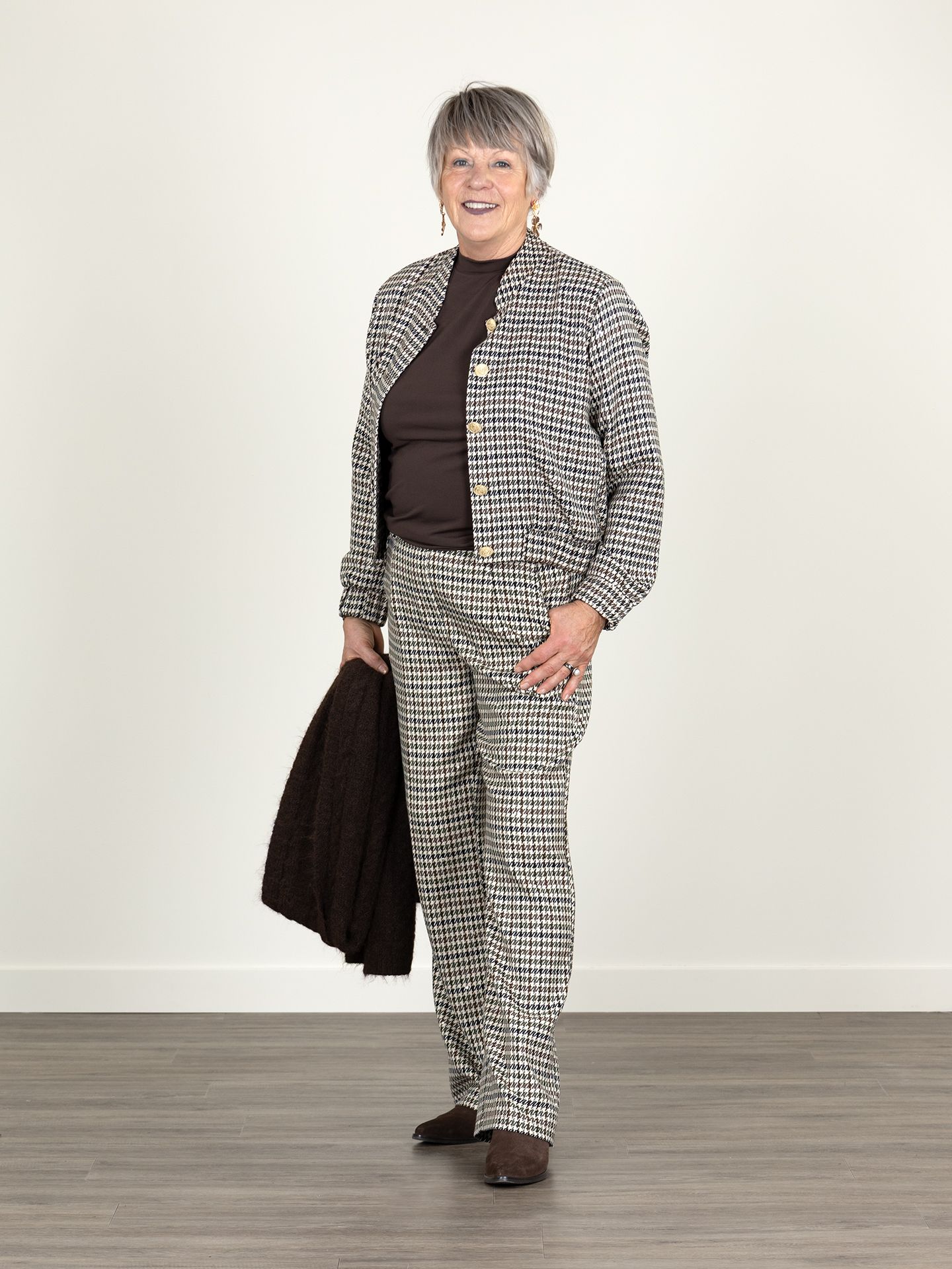 Els is 1.76 m. zij draagt het t-shirt in maat XL en de pantalon en blazer in maat 40.