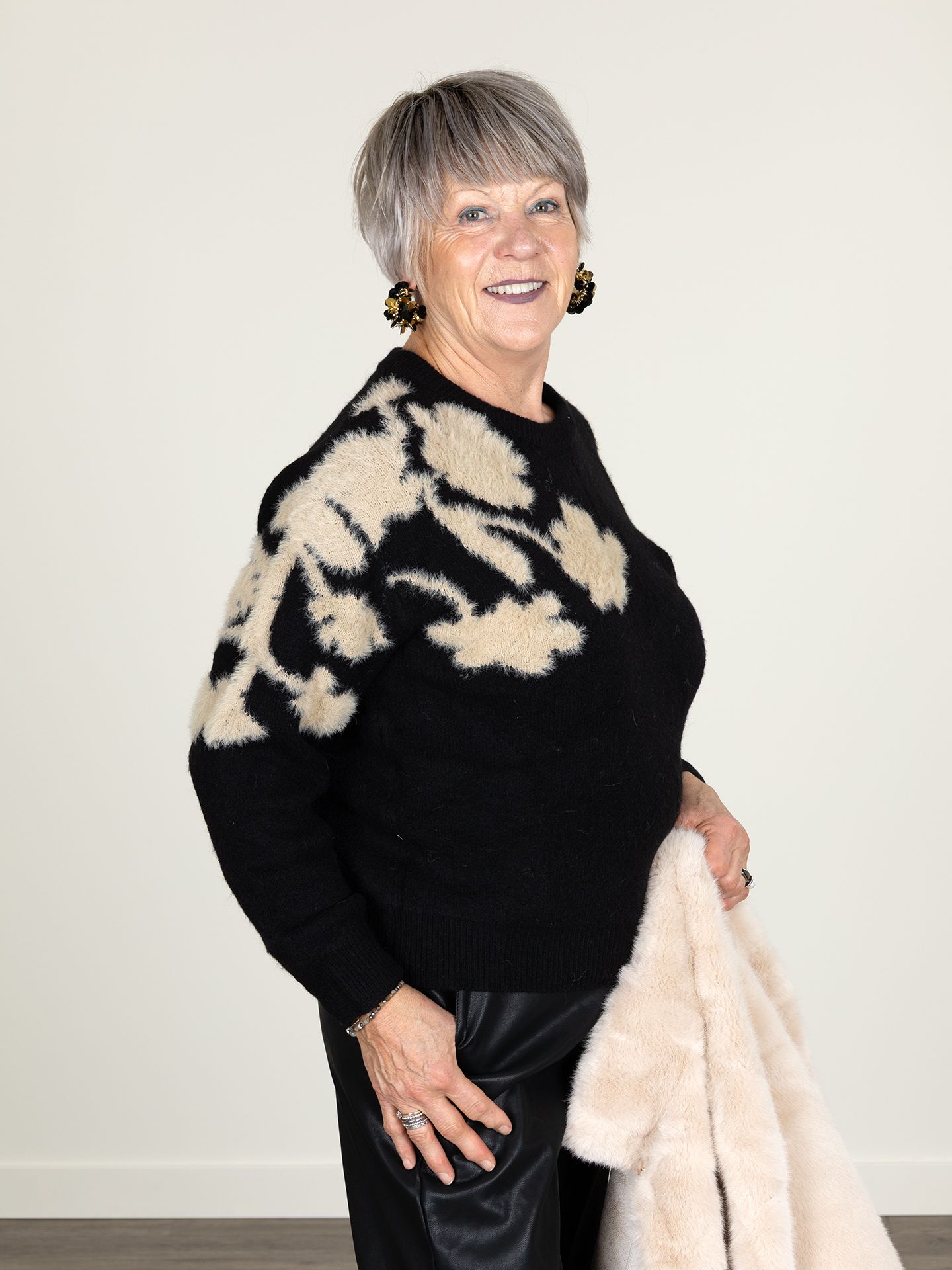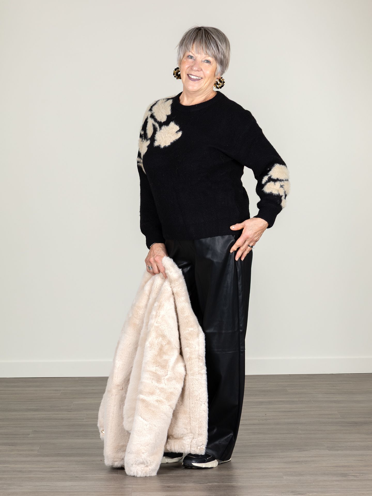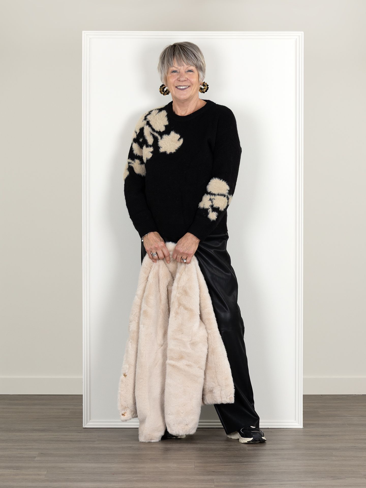 Els is 1.76 m. zij draagt de jas in maat M/L, de trui in maat XL en de broek in maat L.