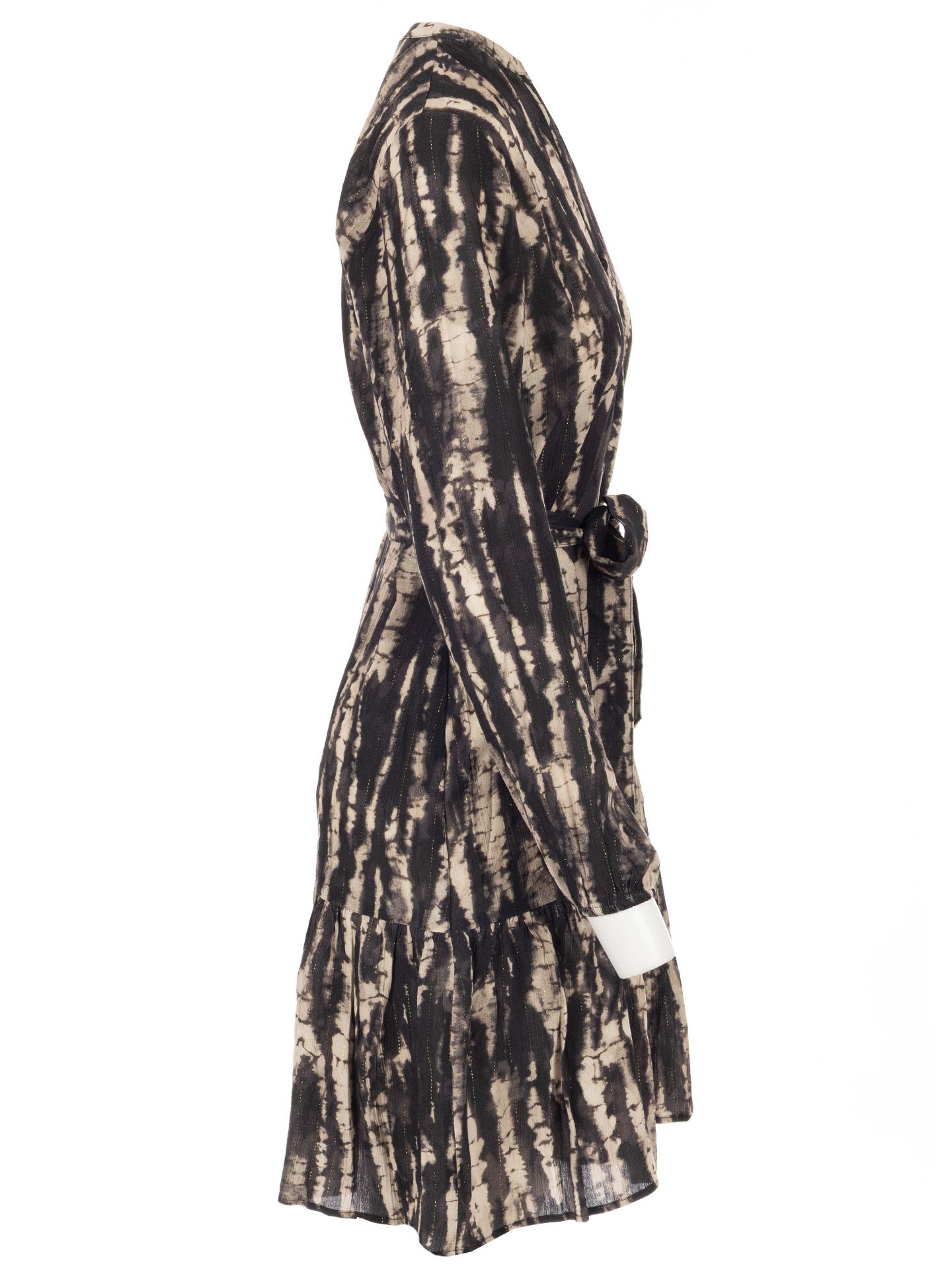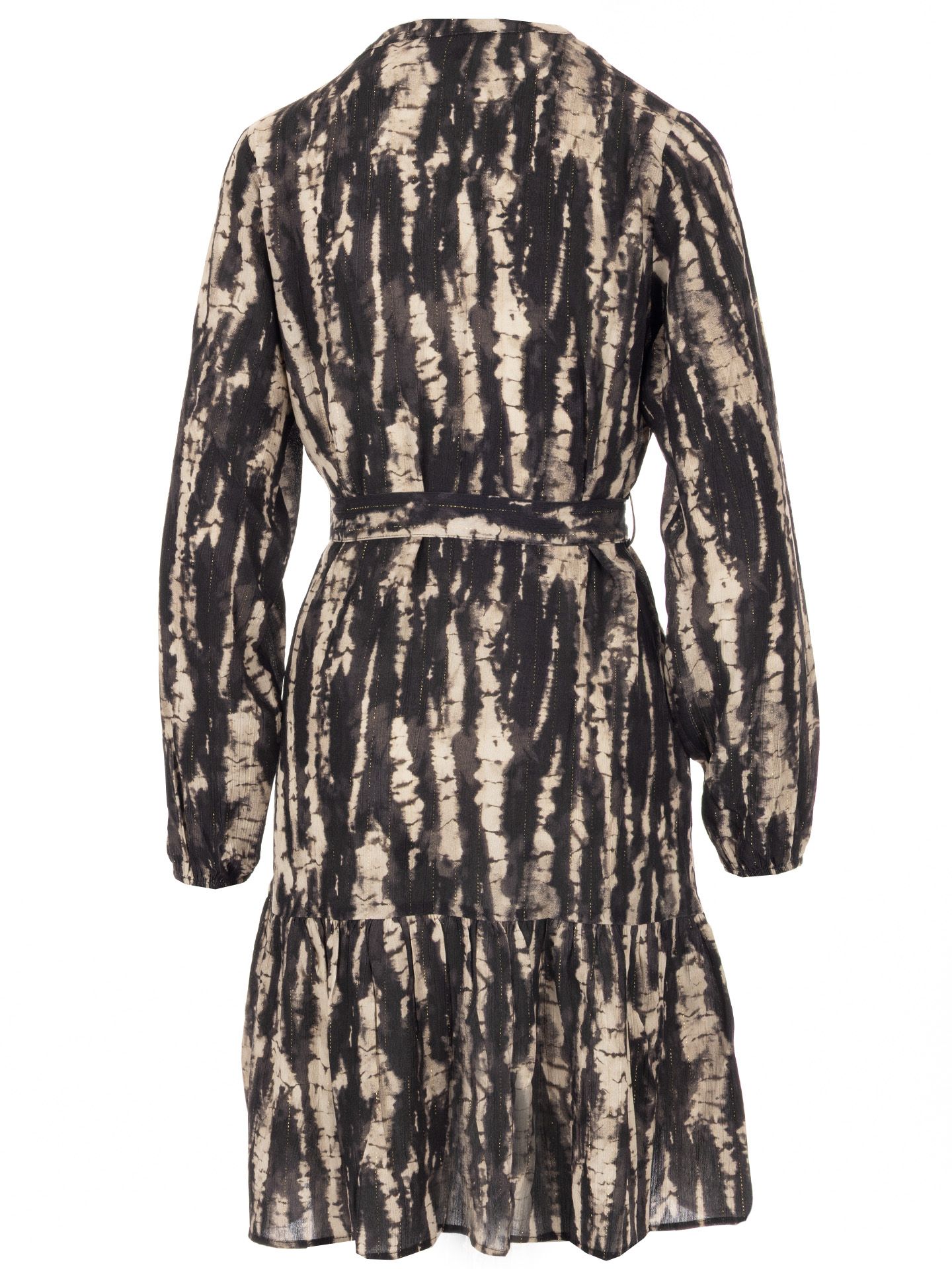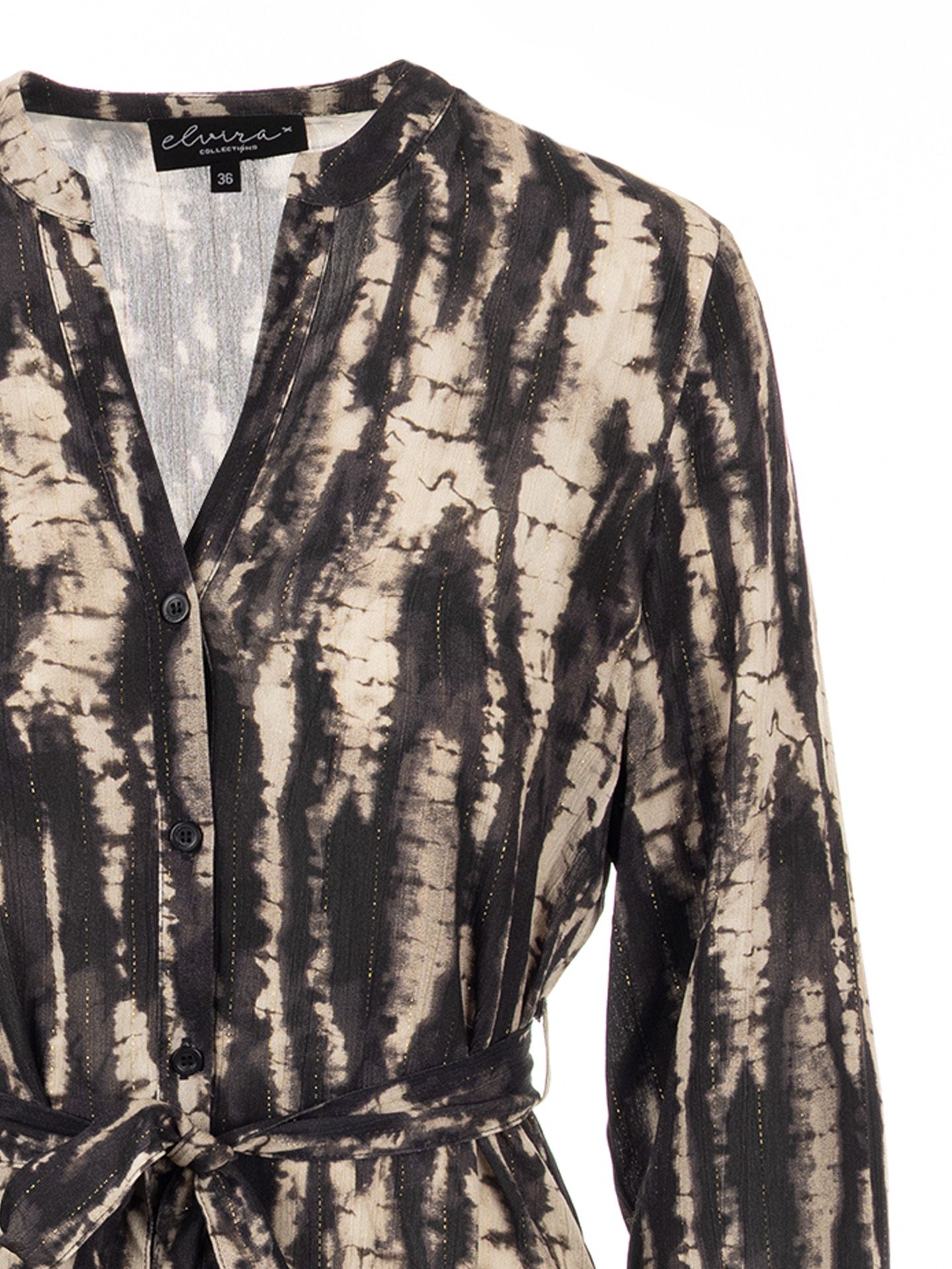Deze jurk van Elvira heeft een speels dessin en een flatterende pasvorm. Het model is voorzien van een V-hals, lange mouwen met lichte plooien en een strikceintuur in de taille voor een vrouwelijk silhouet. De lichte glans in de stof geeft de jurk een elegante uitstraling, perfect voor elke gelegenheid.
