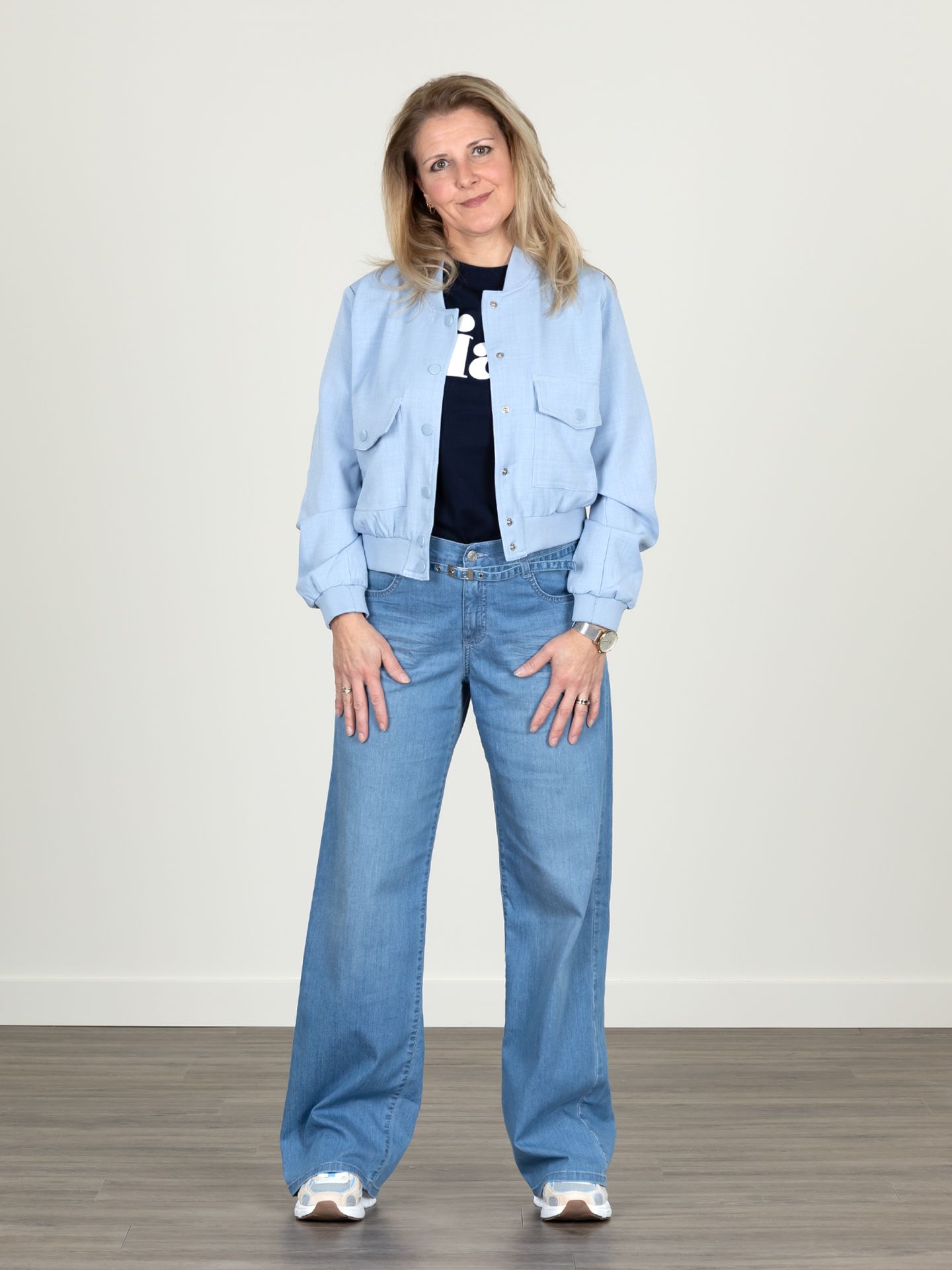 Trudy is 1.64 m. zij draagt de jeans in maat 40/30, het t-shirt en blazer in maat S.
