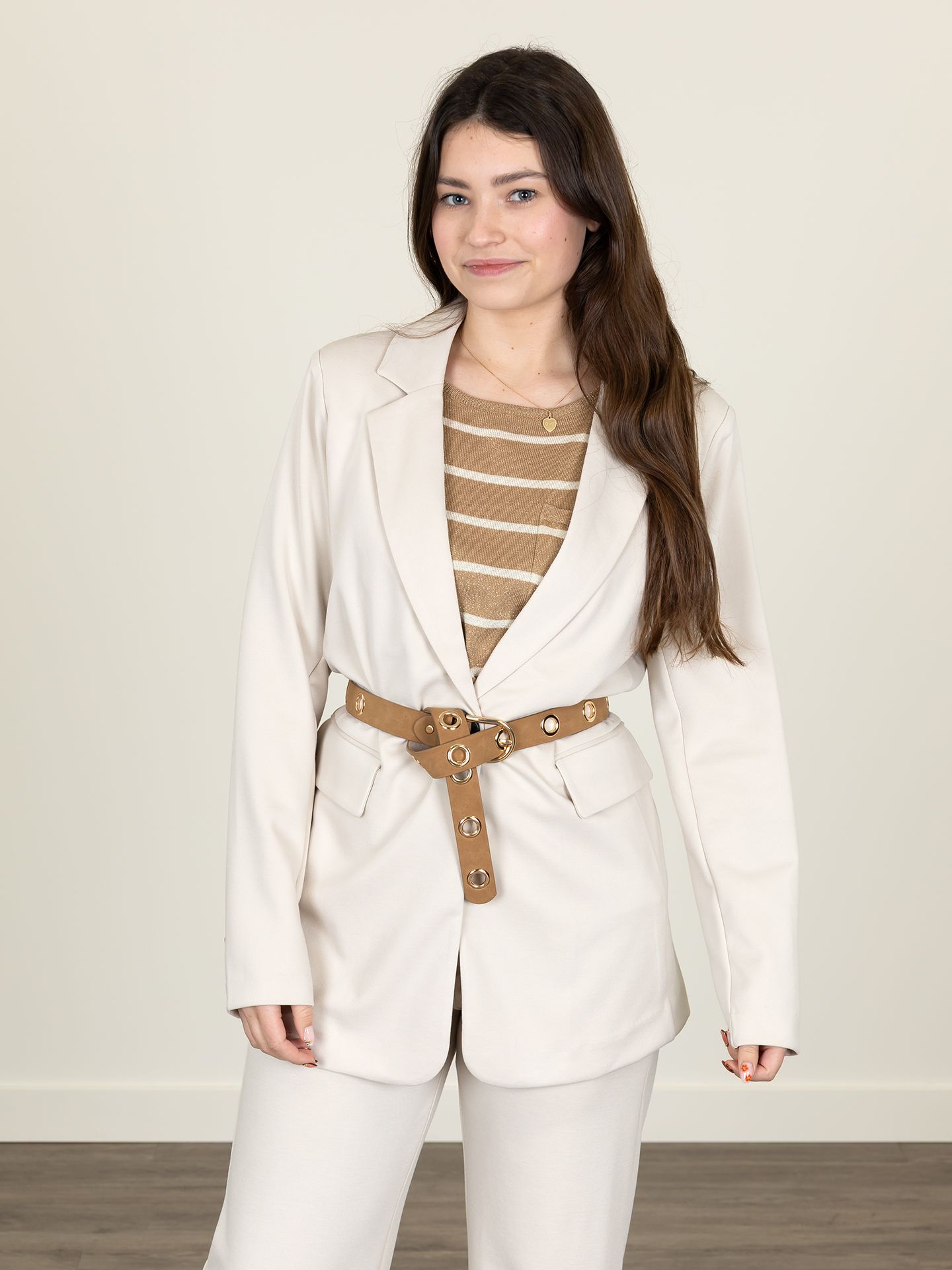 Faye is 1.63 m. zij draagt de broek in maat XS, de blazer en het t-shirt in maat S.