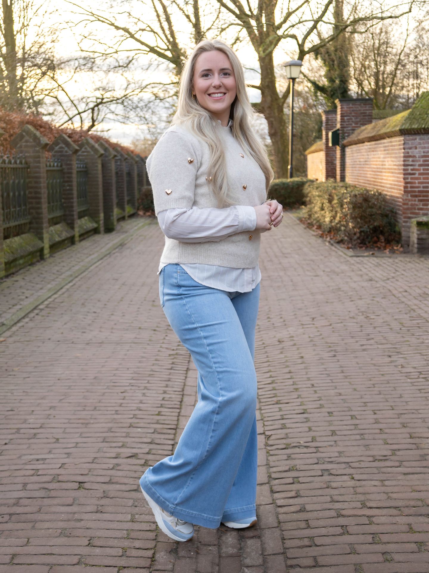 Dana is 1,67 m. zij draagt de jeans in maat 40/32, de blouse in maat M en de trui is one size.