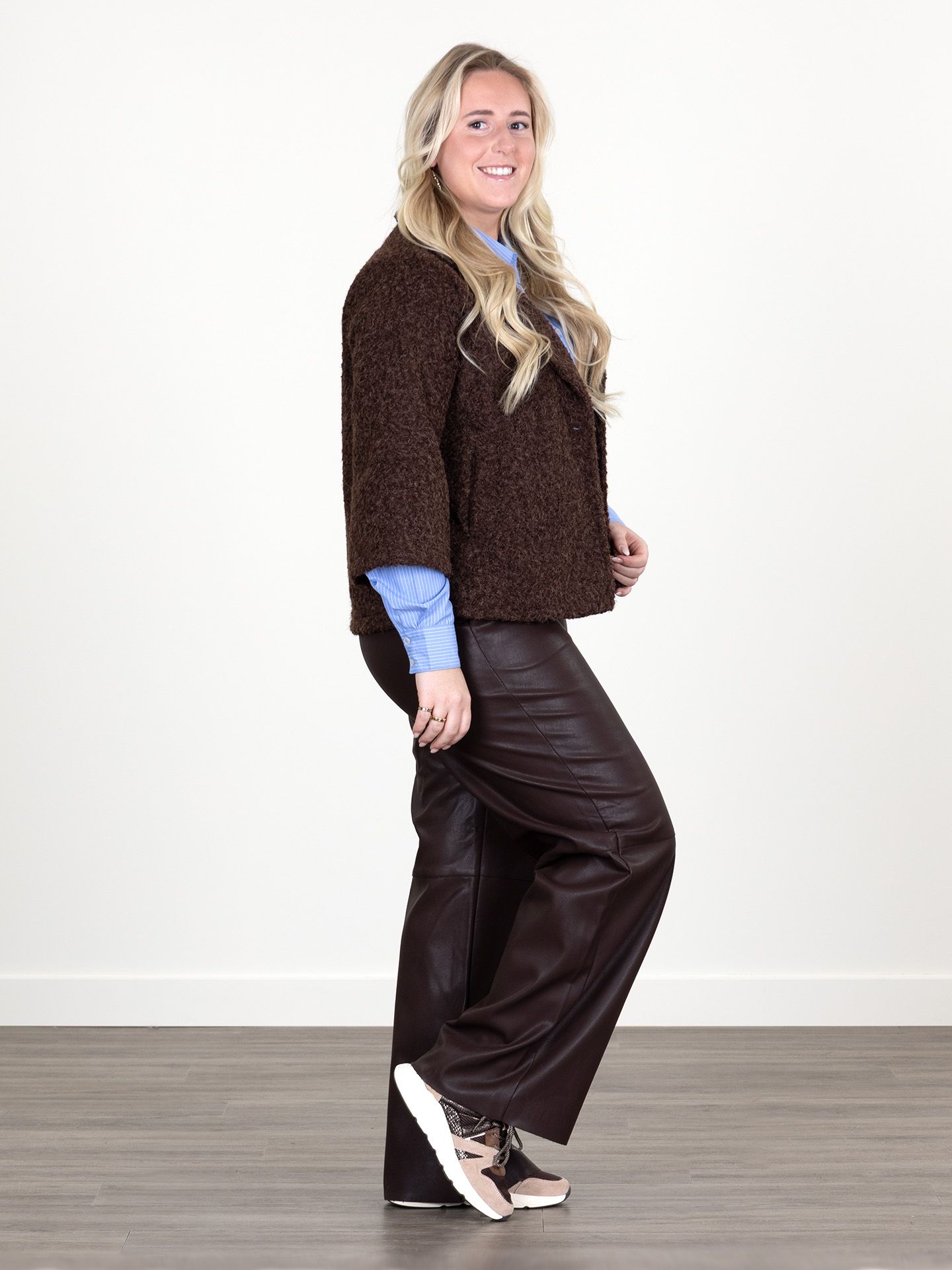 Dana is 1,67 m. zij draagt het jack in maat S/M, de blouse in maat M en de broek in maat L.