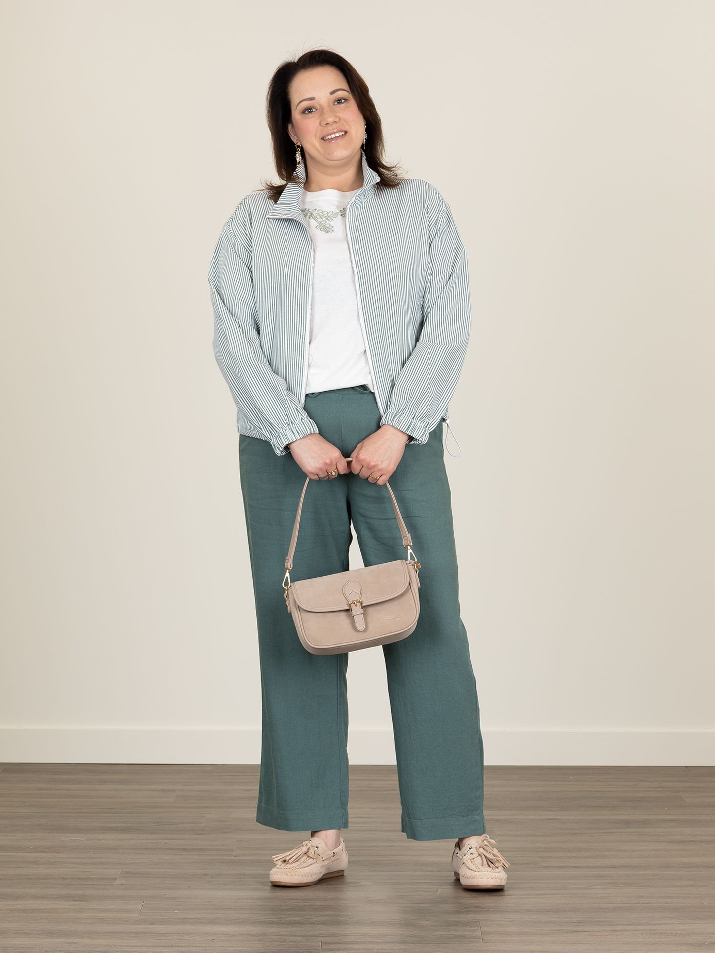 Stephanie is 1.68 m. en draagt haar kleding voornamelijk in maat 40/L.