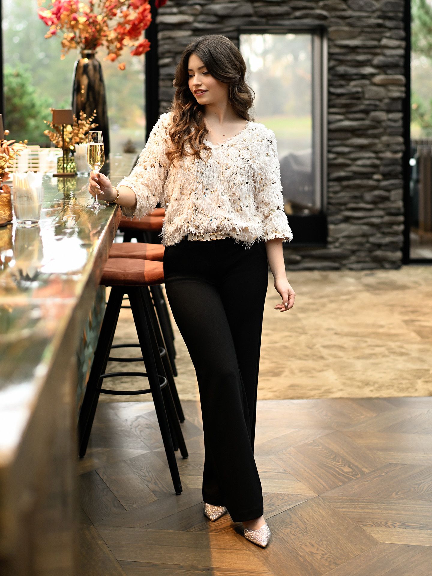 Deze opvallende trui heeft een fluffy structuur met glinsterende pailletten voor een feestelijke uitstraling. De V-hals en driekwartmouwen geven het ontwerp een vrouwelijke touch. Perfect om te dragen bij een jeans of rok voor een stijlvolle look met een vleugje glamour.