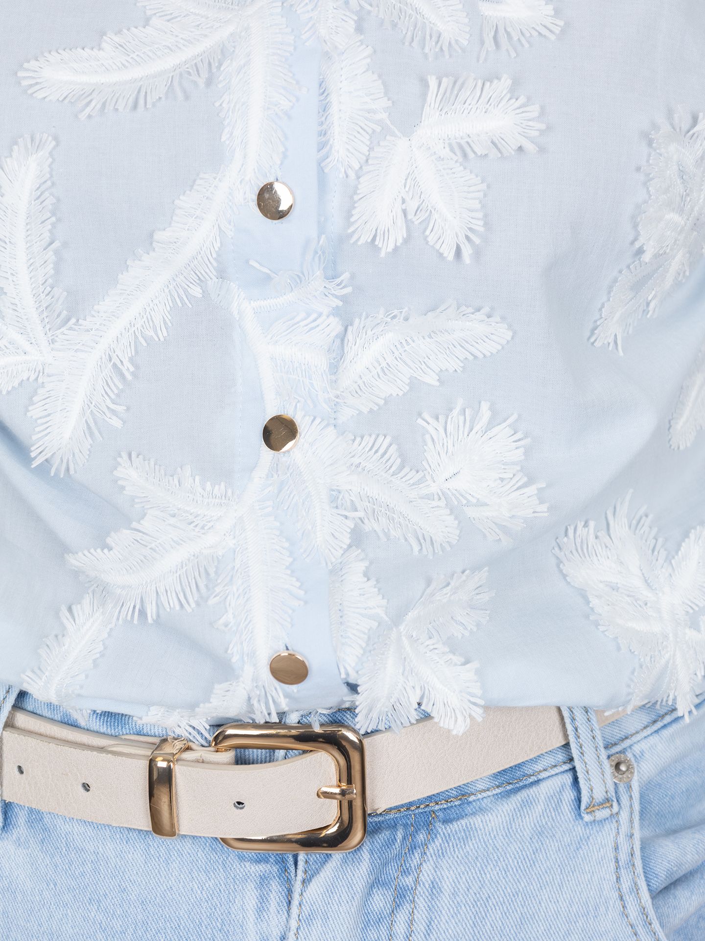 Giny is 1.67m zij draagt het vest in maat 36, de jeans in maat 38 en de blouse in maat S.
