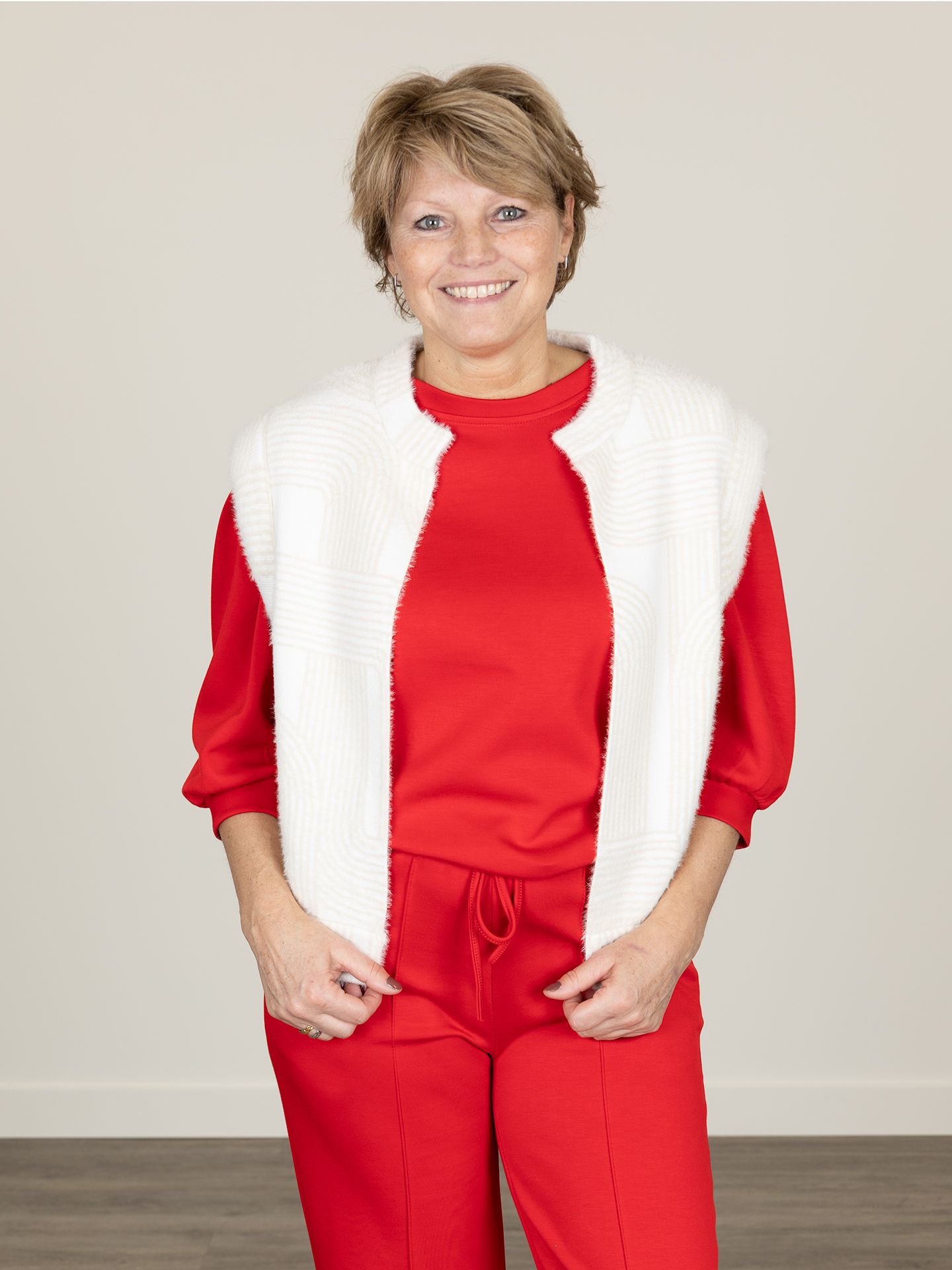 Giny is 1.67m zij draagt de broek in maat S, het gilet en de broek in maat M.