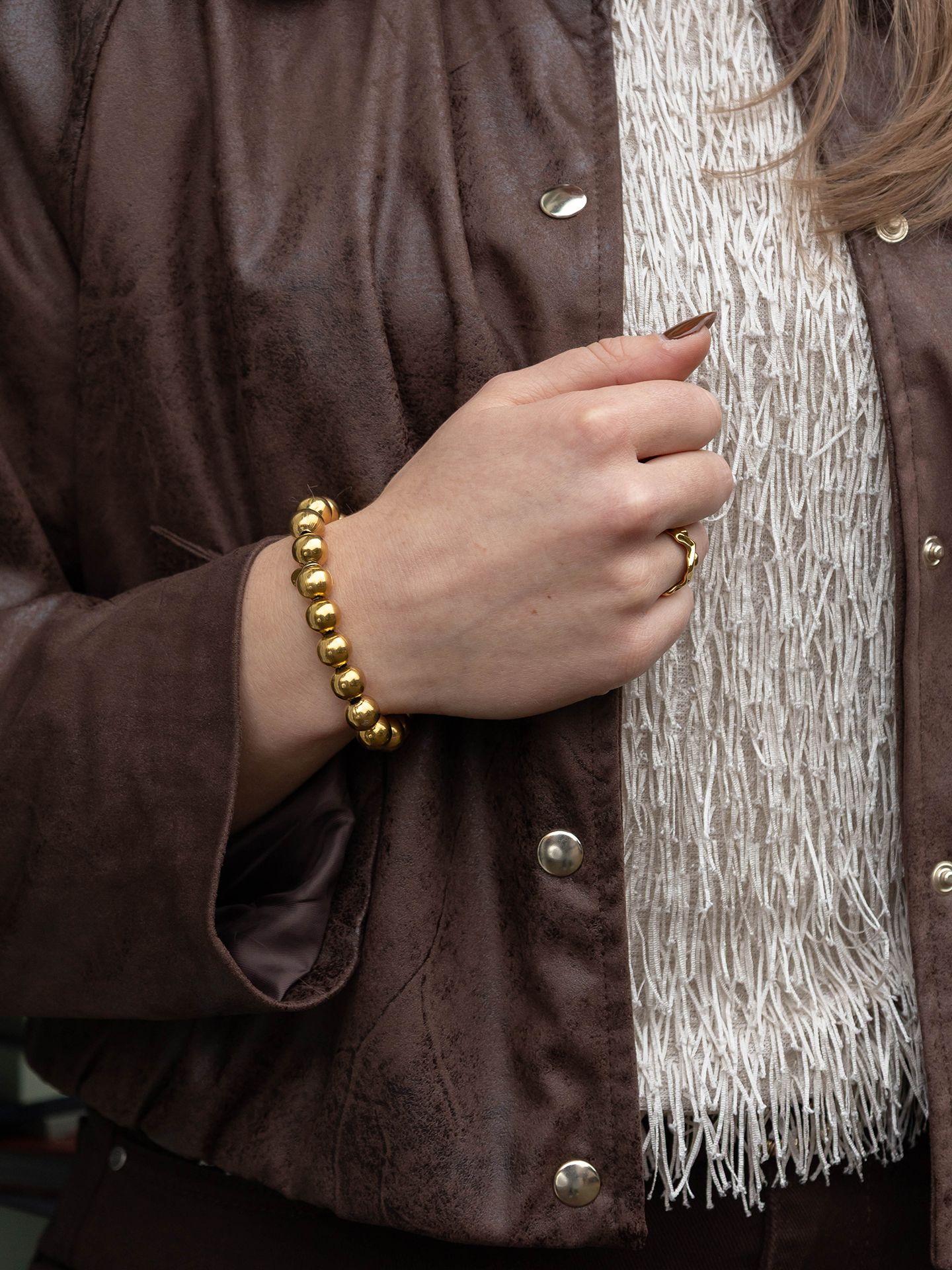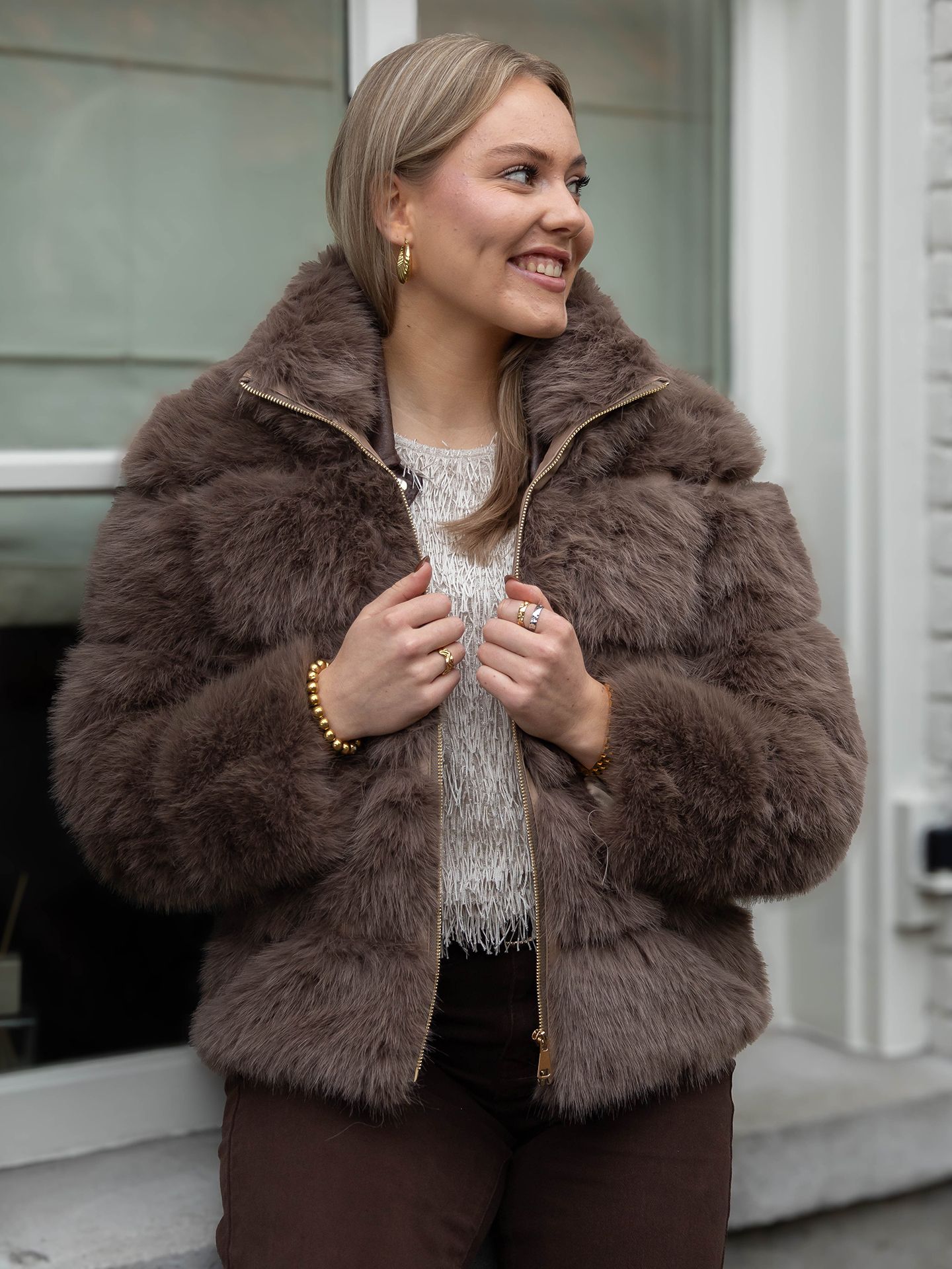 Imke is 1.78 m zij draagt de jas in maat L/XL, de jeans in maat 36, de trui en blazer in maat S.