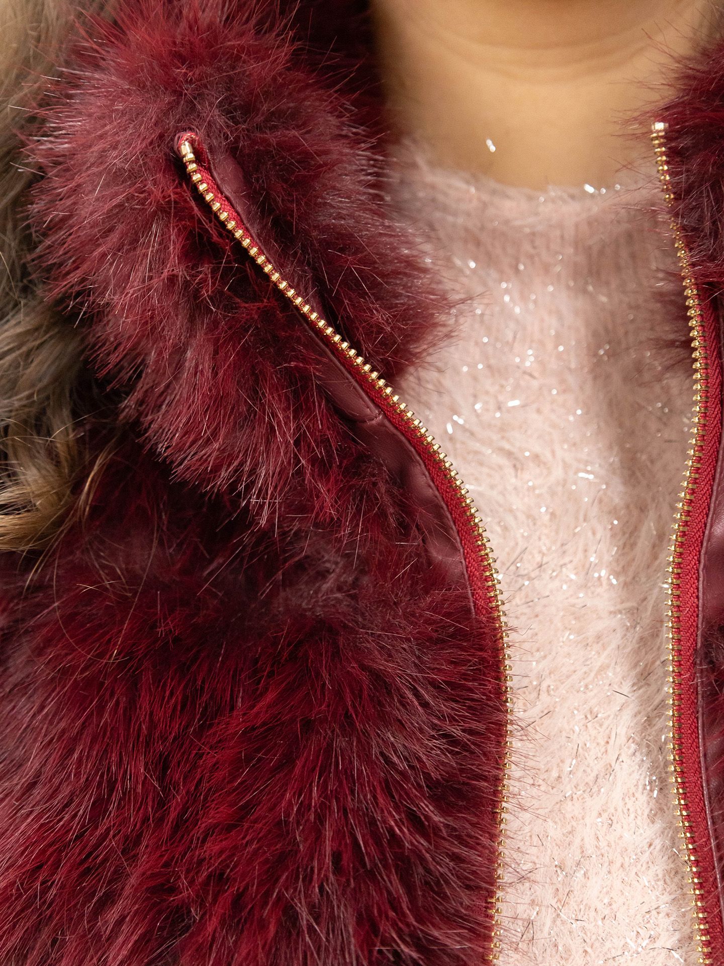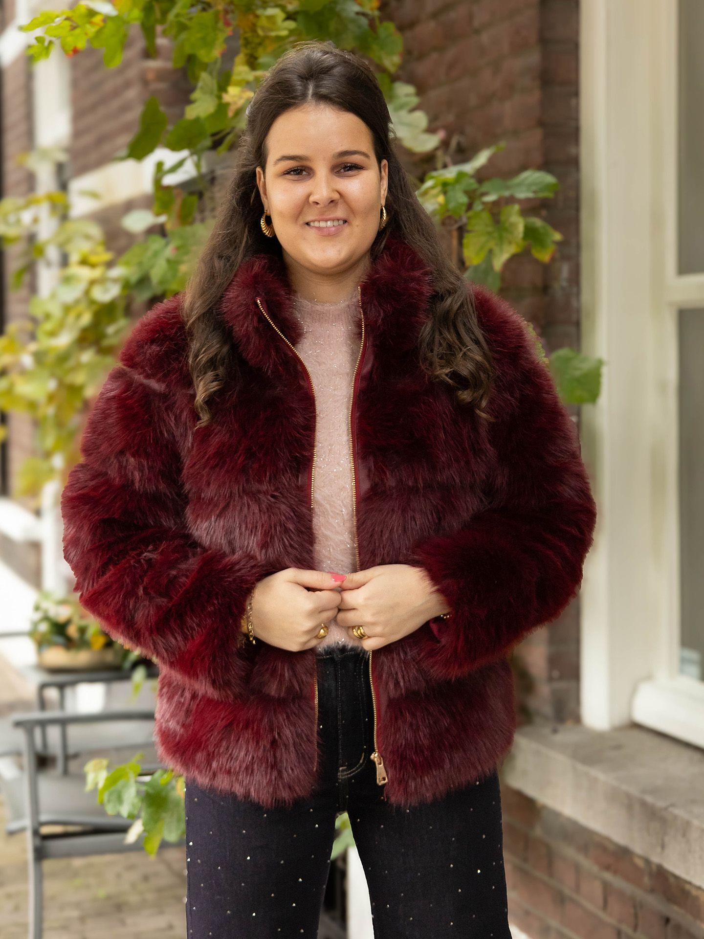 Isabelle is 1,69 m. zij draagt het jack in maat S/M, de trui in maat M, de jeans in maat 38 en de blazer in maat S.