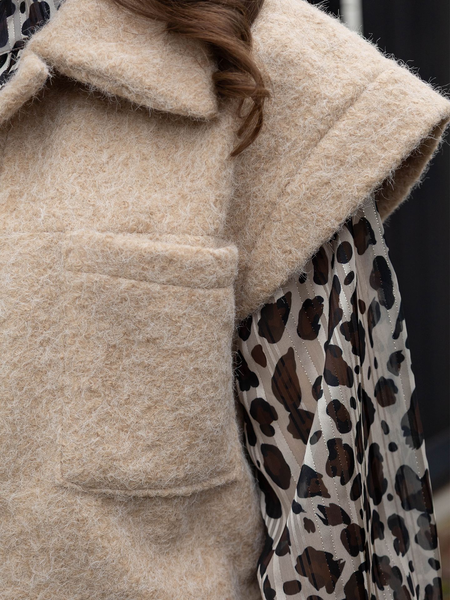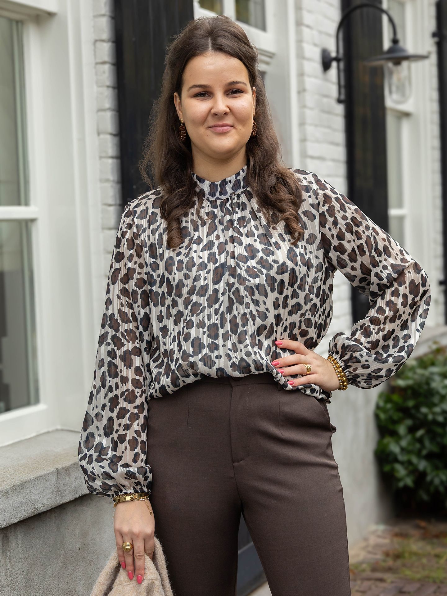Isabelle is 1,69 m. zij draagt het gilet in maat S/M, de blouse in maat M en de broek in maat 38.
