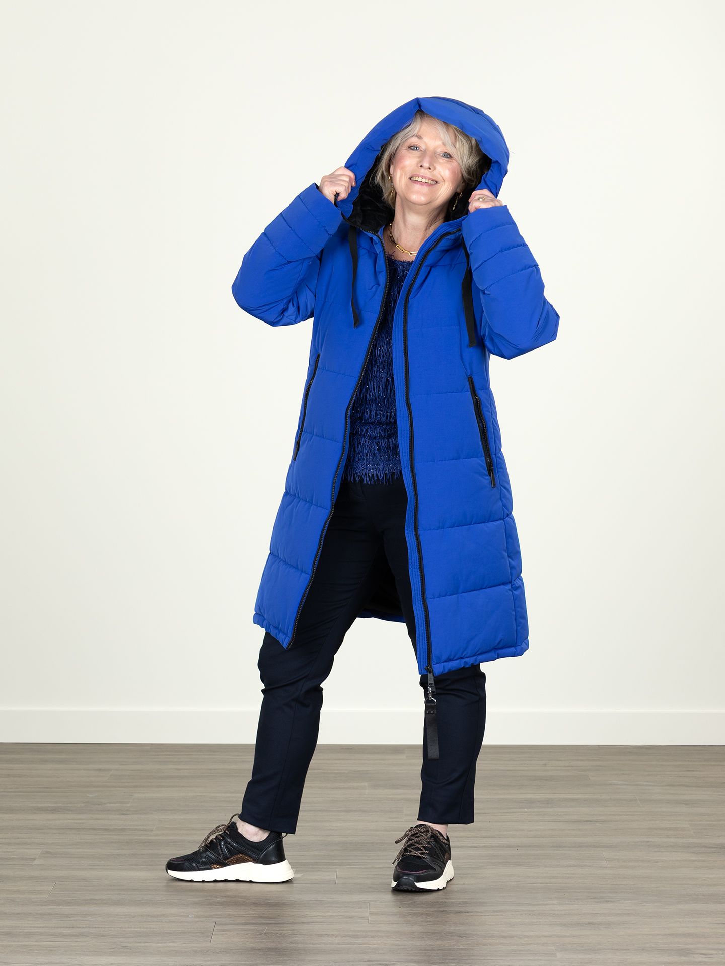 Janet is 1.60 m. zij draagt de jas in maat M, het t-shirt in maat S en de broek in maat 38/30.