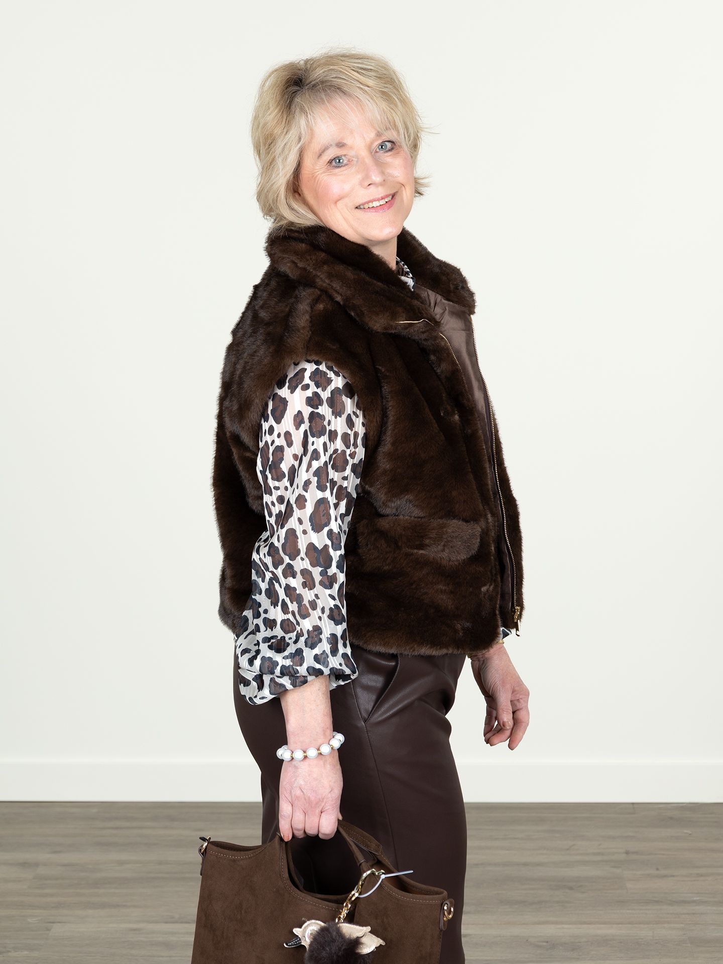 Janet is 1.60 m. zij draagt de broek en blouse in maat M en het gilet is one size.