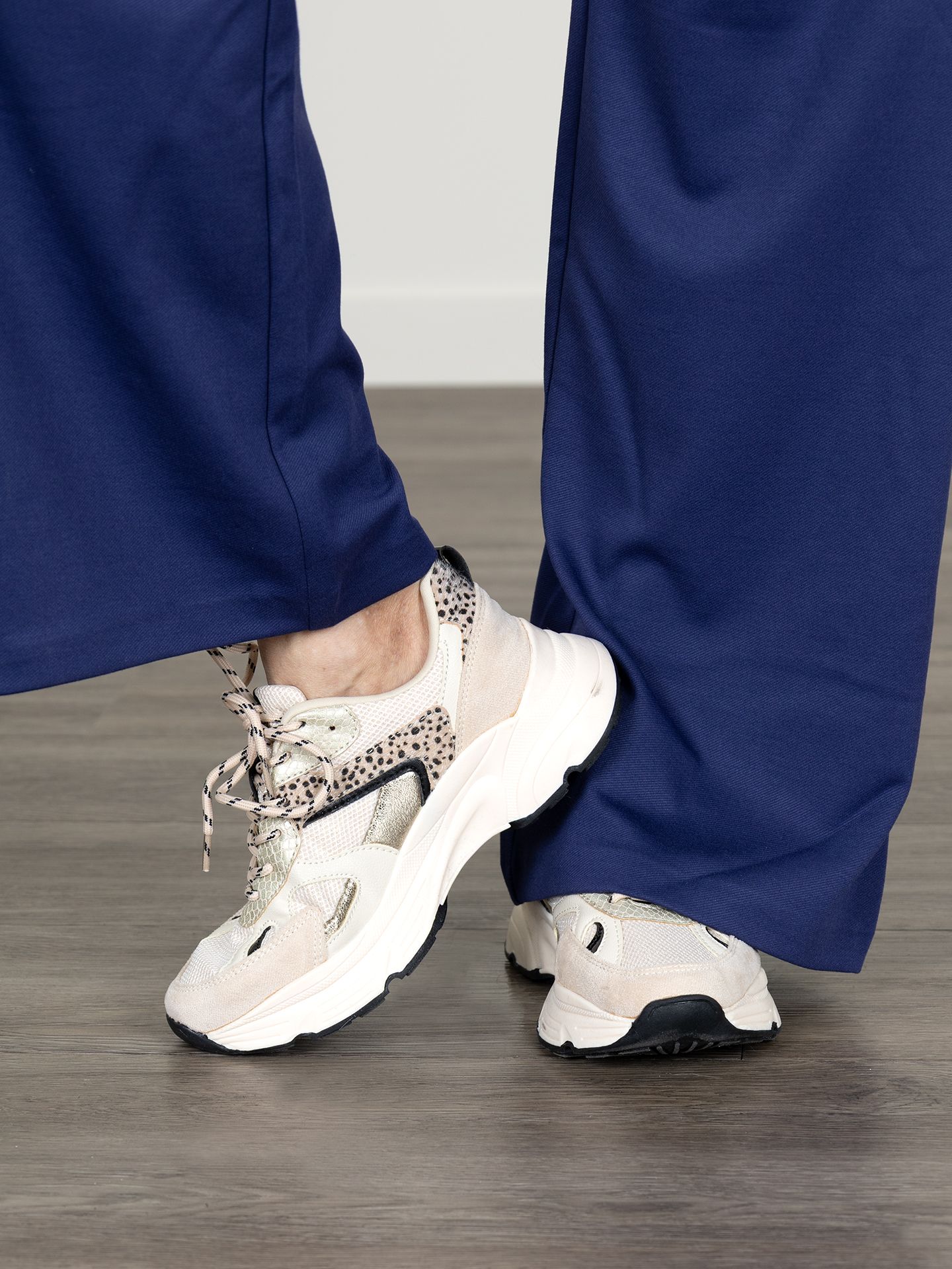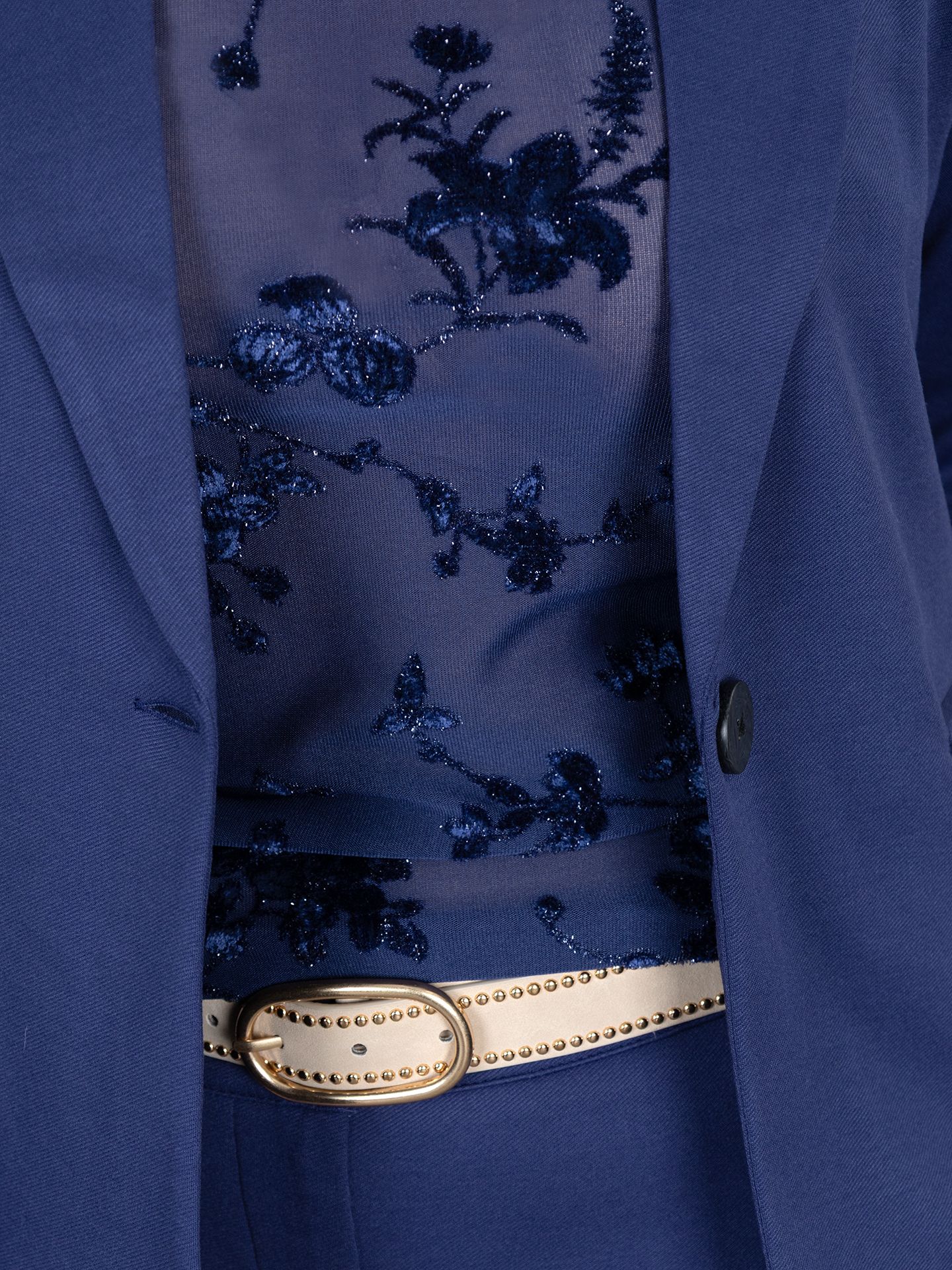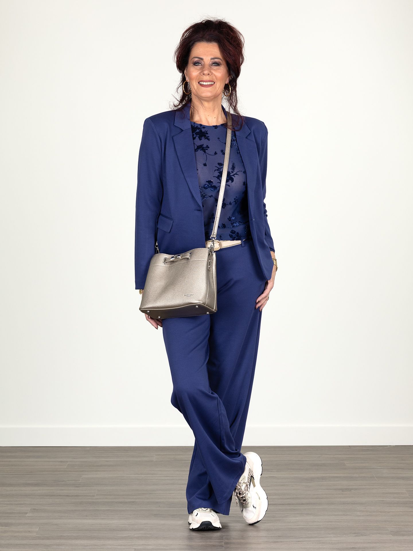 Lian is 1.74 m. zij draagt de top in maat S, de blazer in maat M en de pantalon in maat L.