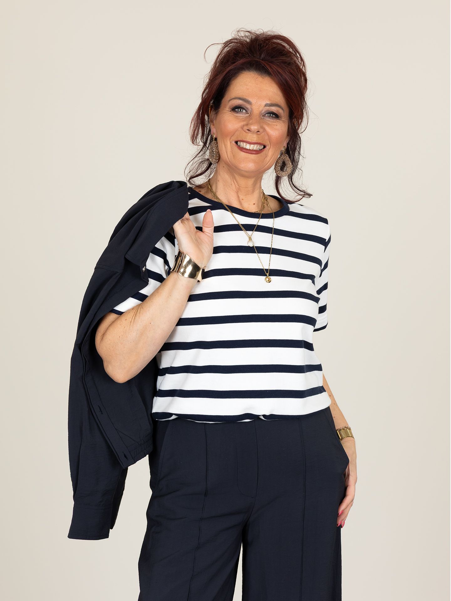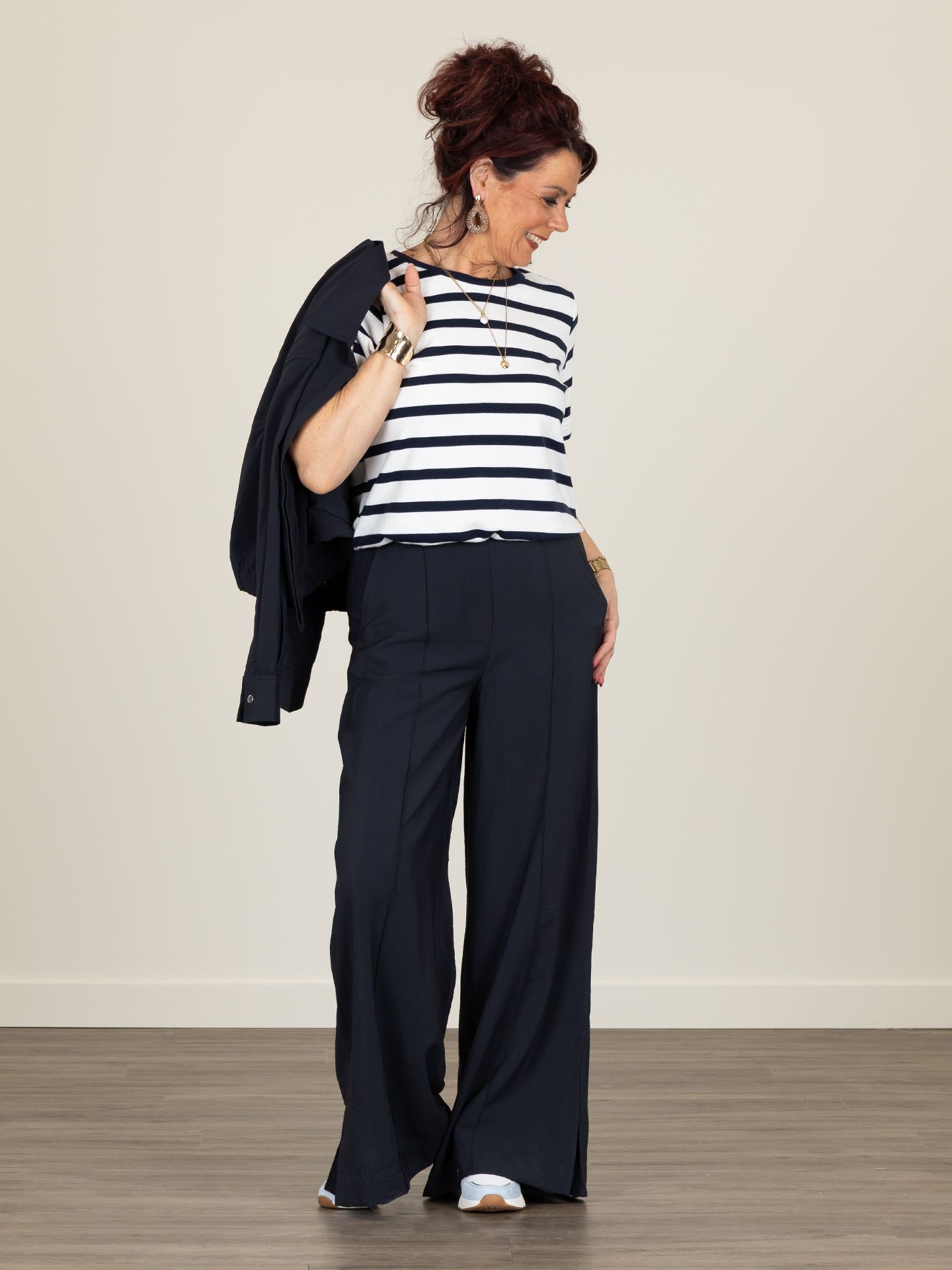 Lian is 1.74 m. zij draagt de blazer in maat 36, de broek in maat 40 en het t-shirt in maat M.