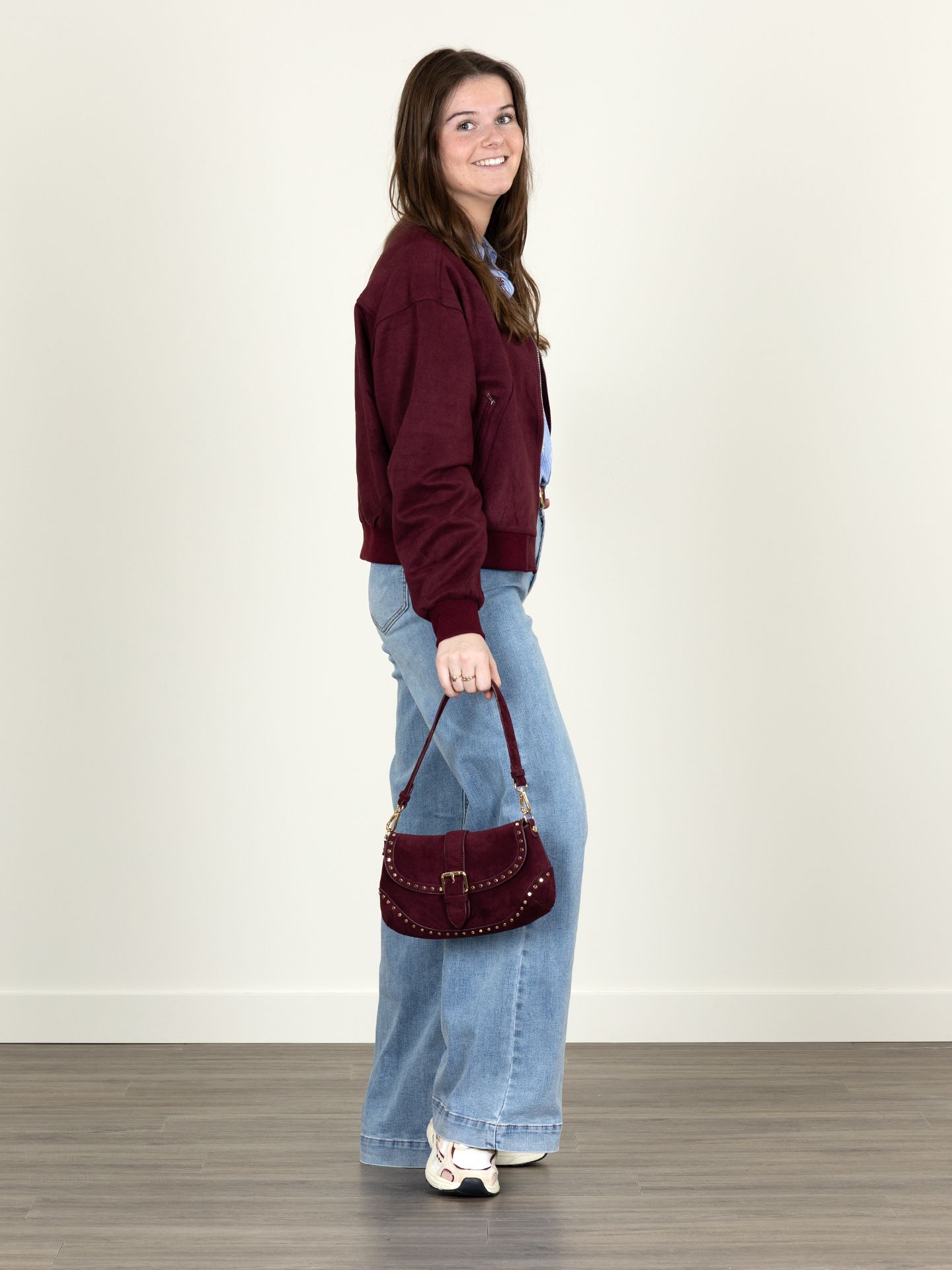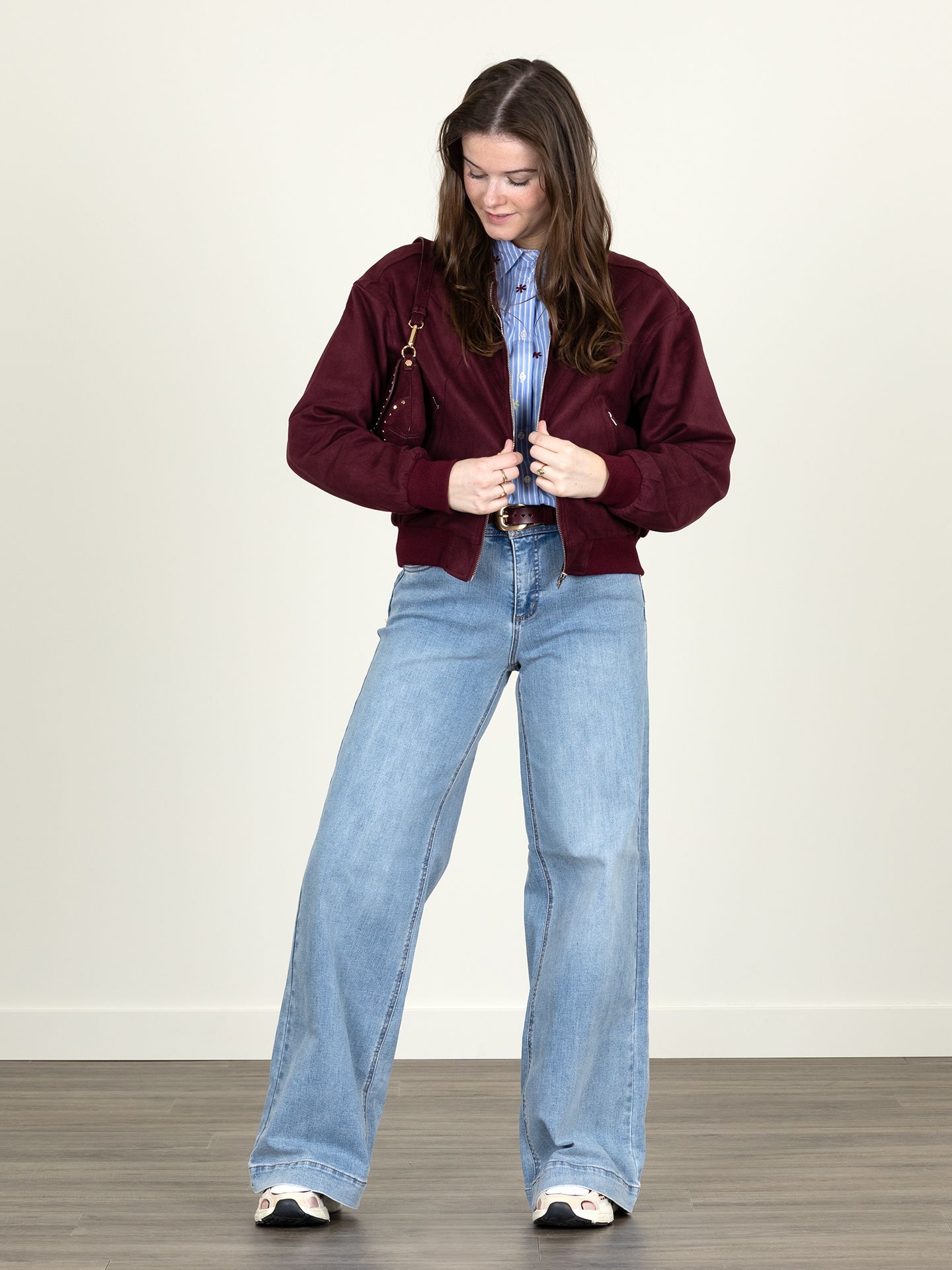 Marit is 1.68 m. zij draagt het jack in maat S, de blouse in maat XS en de jeans in maat 27.