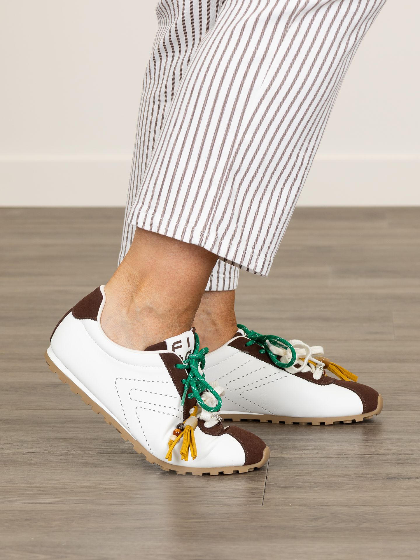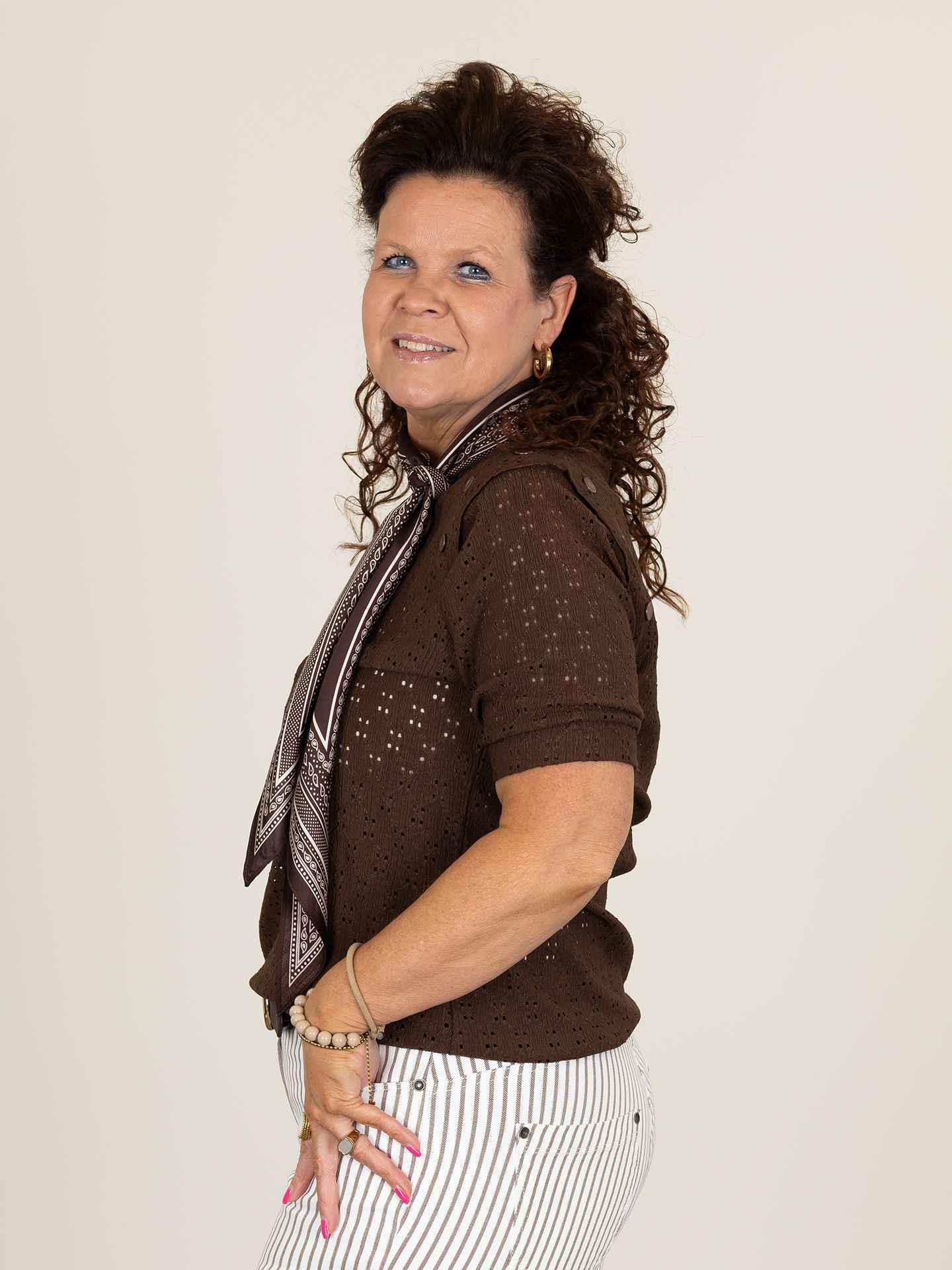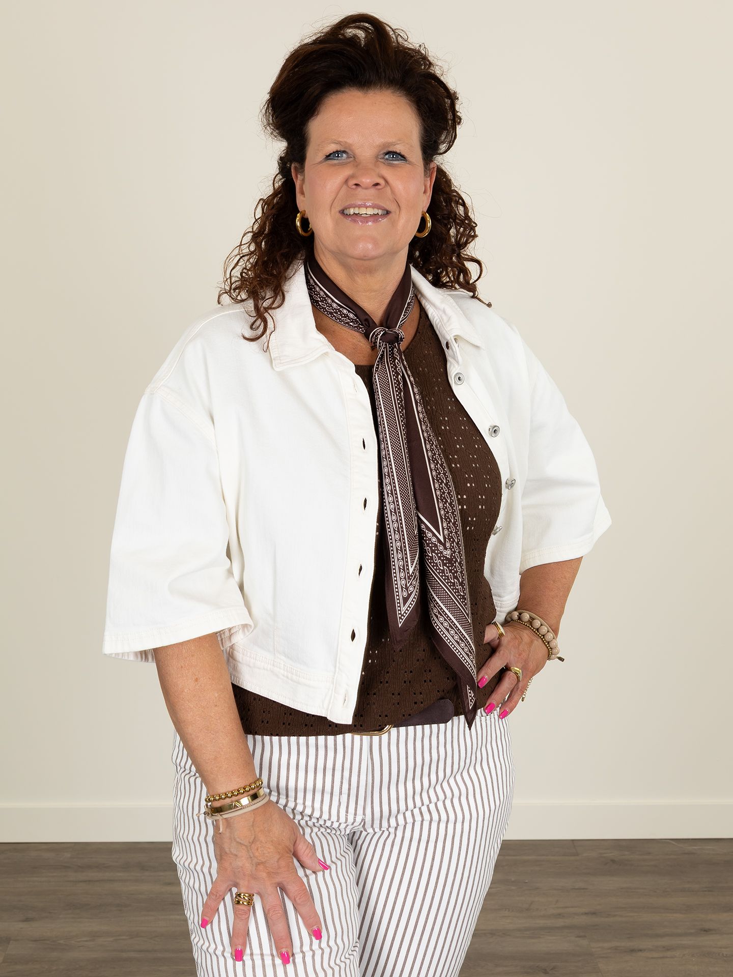 Marion is 1.67 m. zij draagt het t-shirt in maat M, de jeans in maat 42 en de blazer in maat 40.