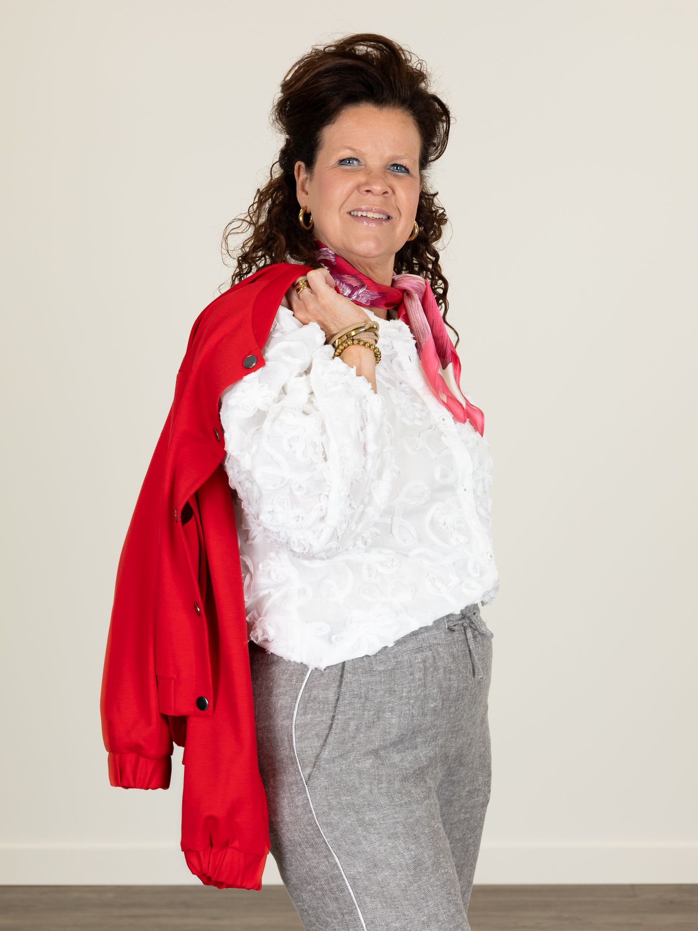 Marion is 1.67 m. zij draagt de gehele outfit in maat L.