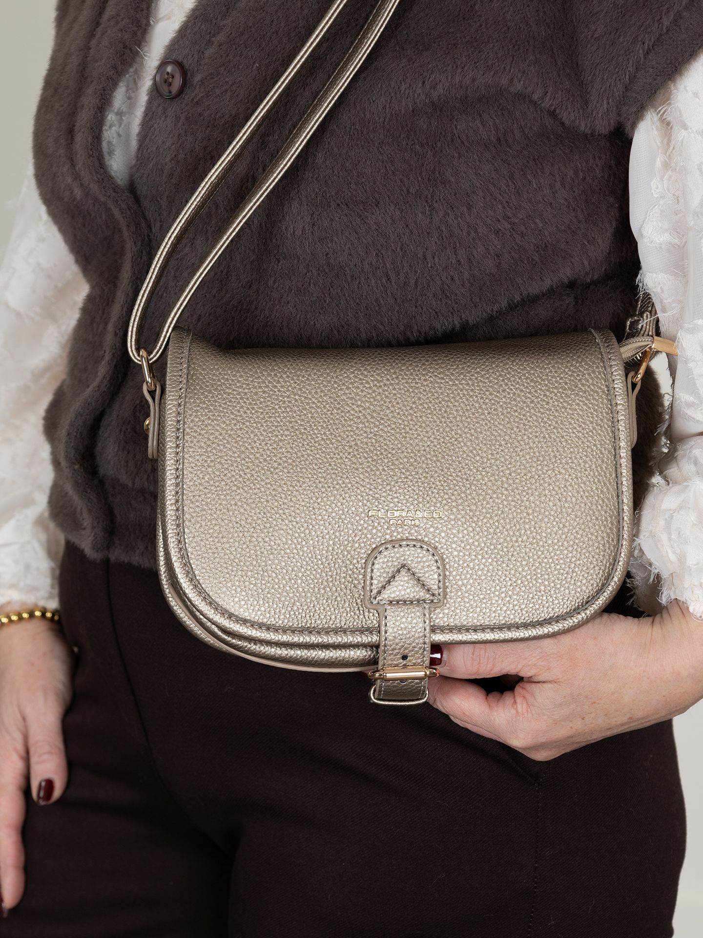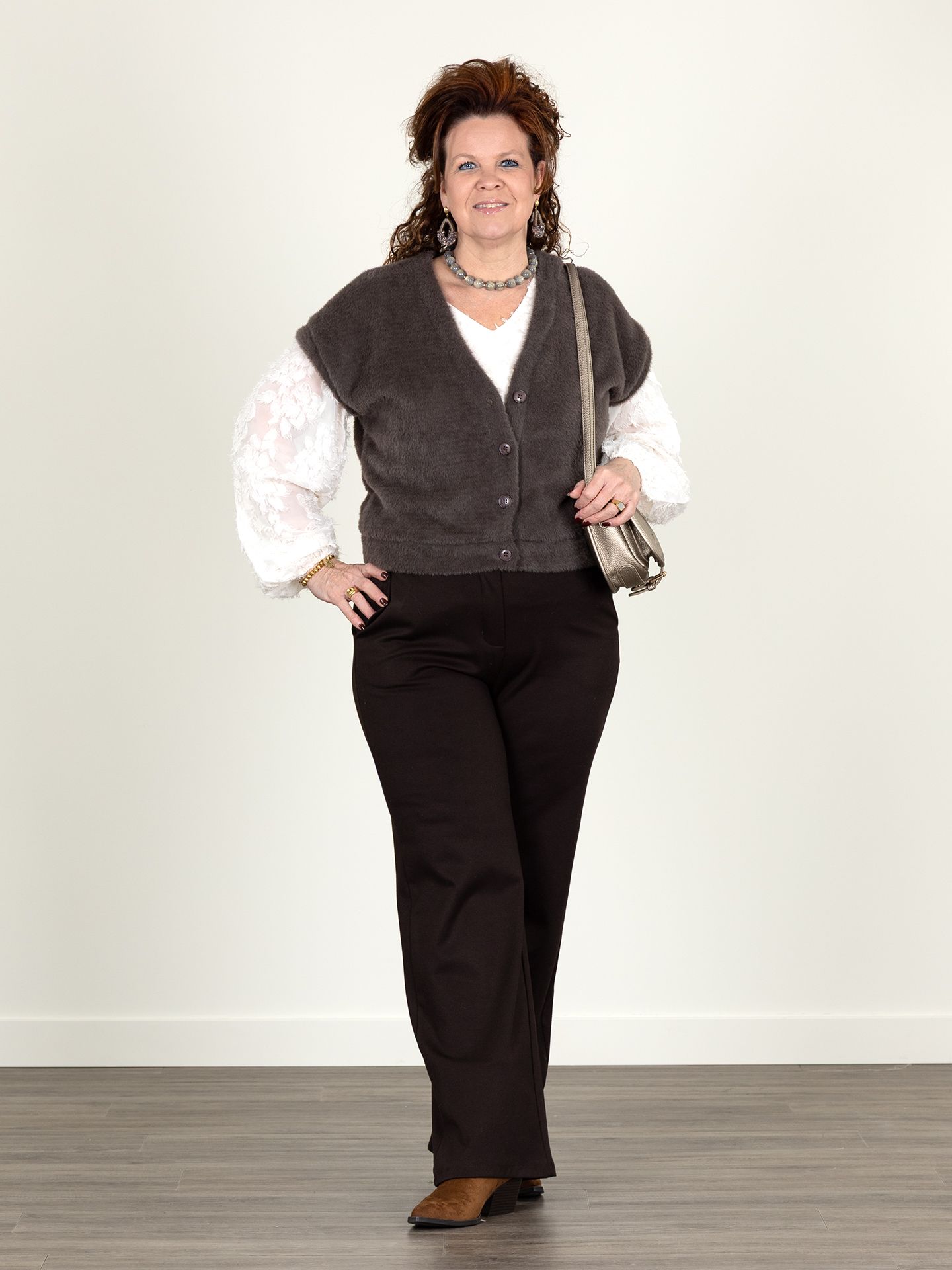 Marion is 1.67 m. en draagt het jack in maat L, de broek in maat XL, het vest en de blouse in maat M.