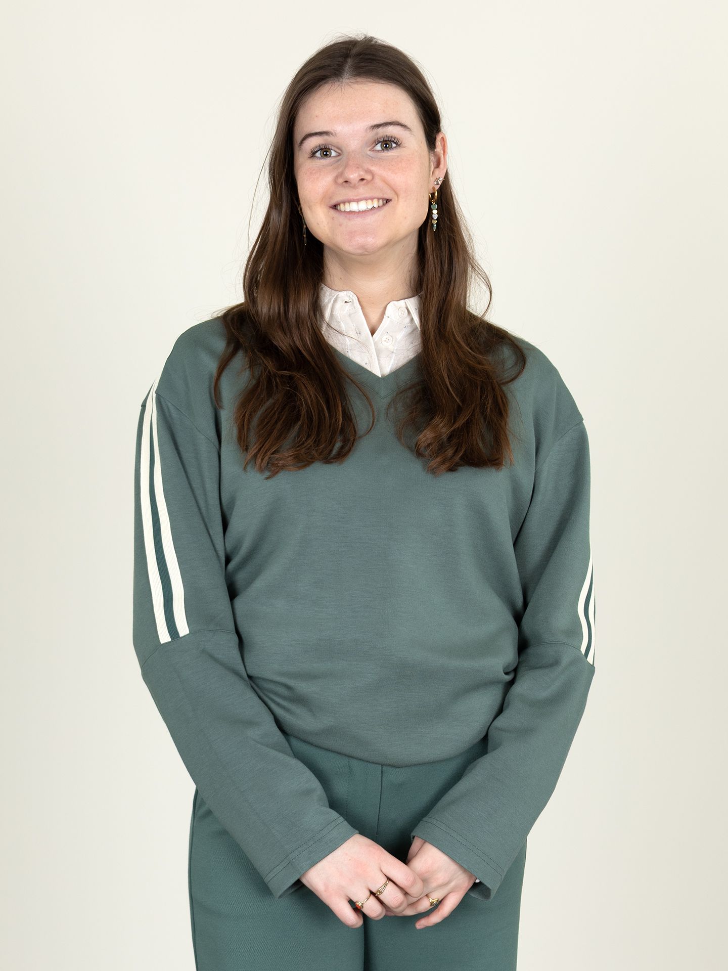 Marit is 1.68 m. zij draagt de trui in maat S, de blouse en broek in maat XS.