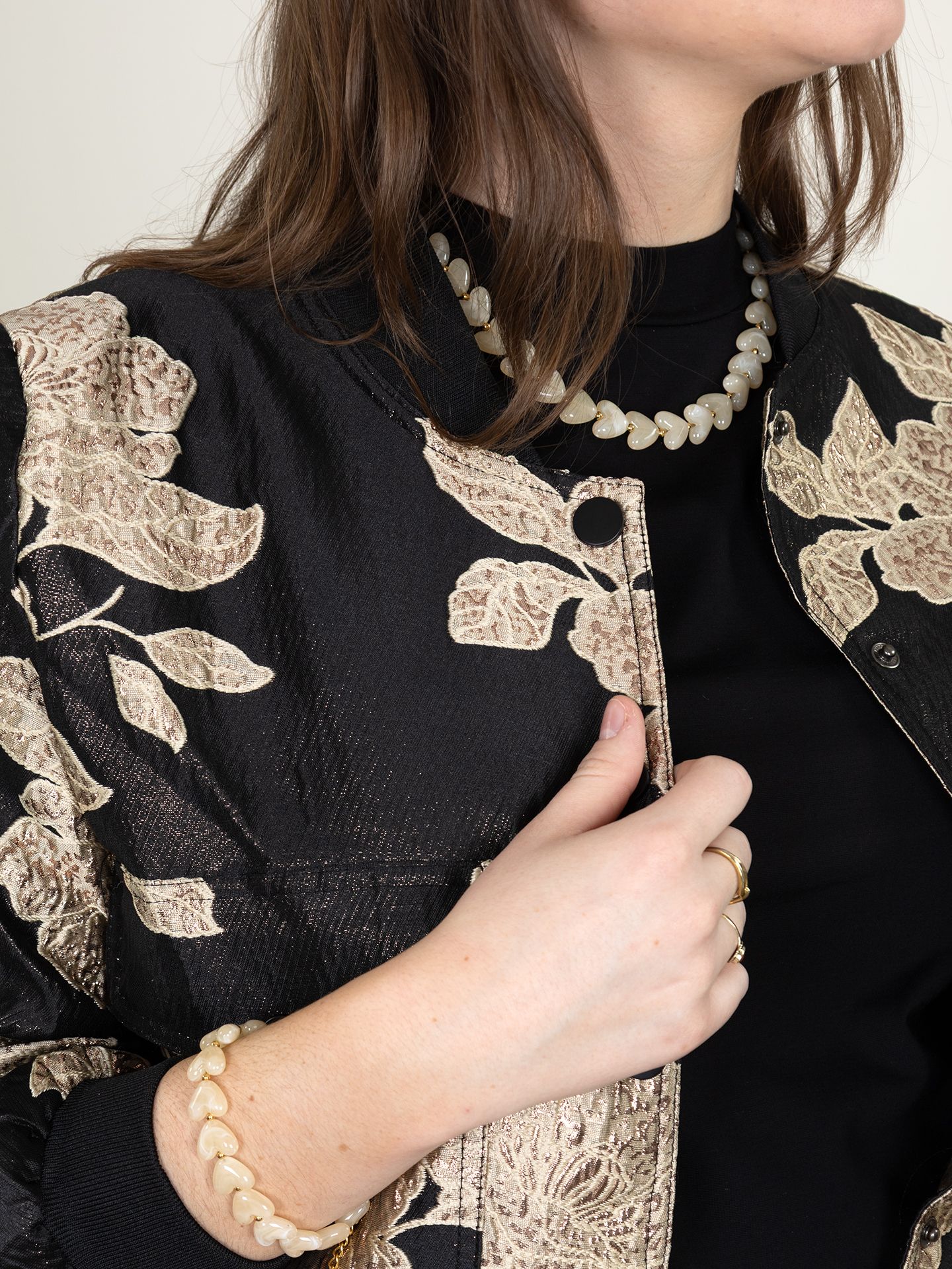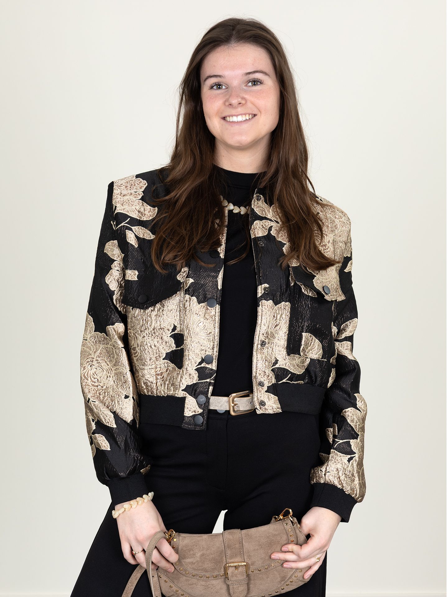 Marit is 1.68 m. zij draagt de broek in maat XS, het t-shirt en blazer in maat S.