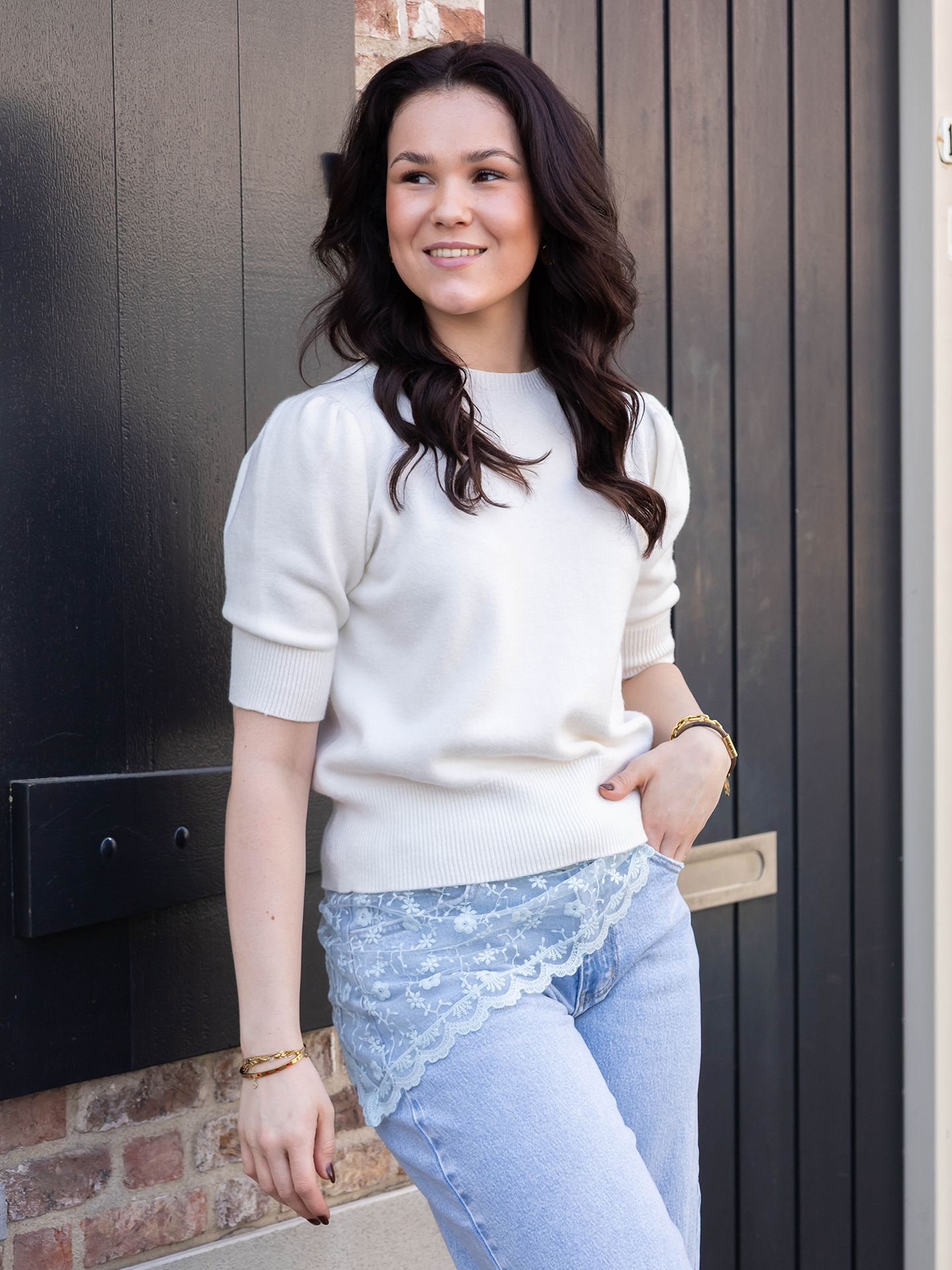 Maud is 1.70 m. zij draagt de jeans in maat 38 en de trui in maat XS/S.