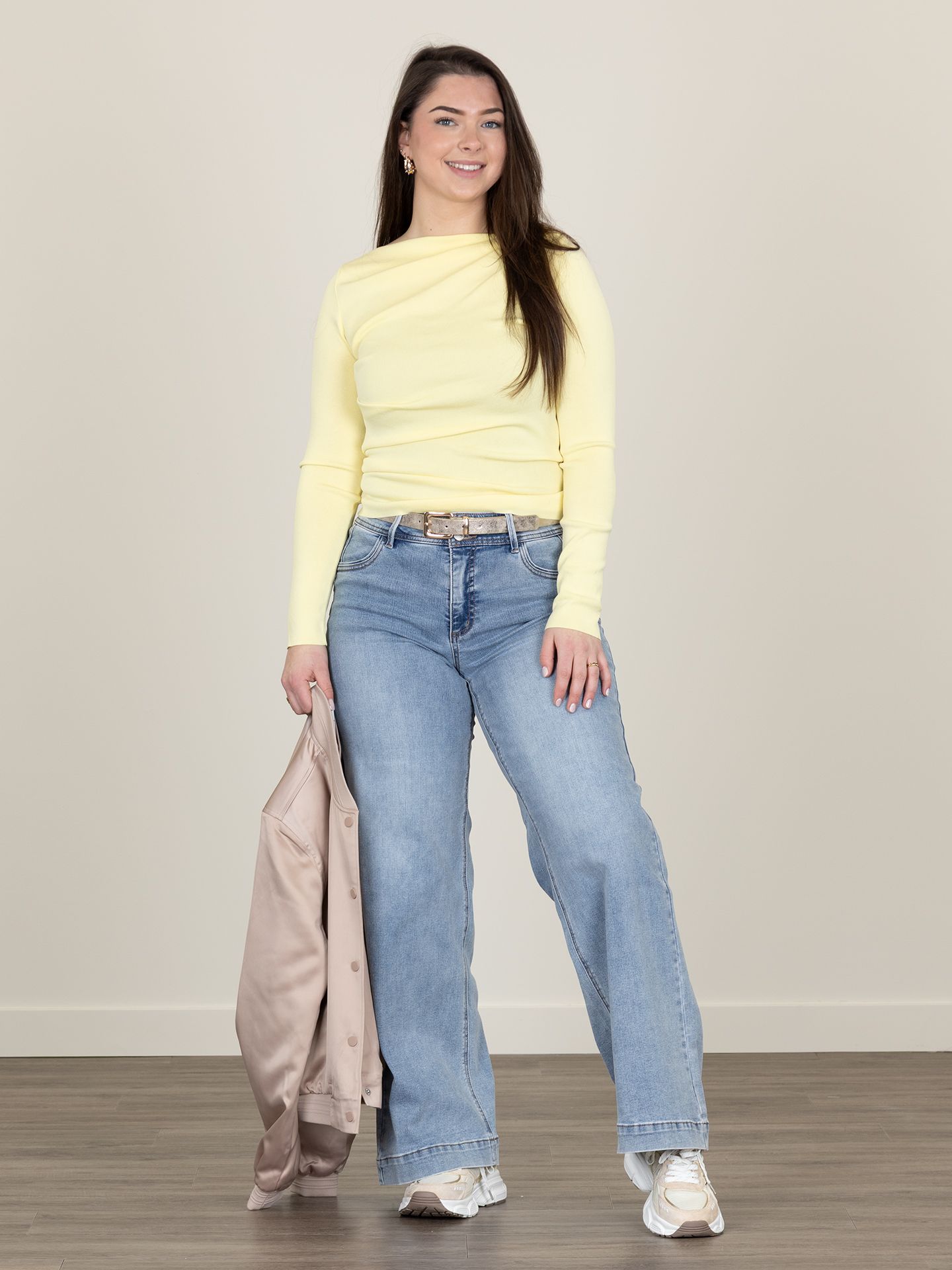 Nicole is 1.73m zij draagt het jack in maat 36, de jeans in maat 30 en het t-shirt in maat M.