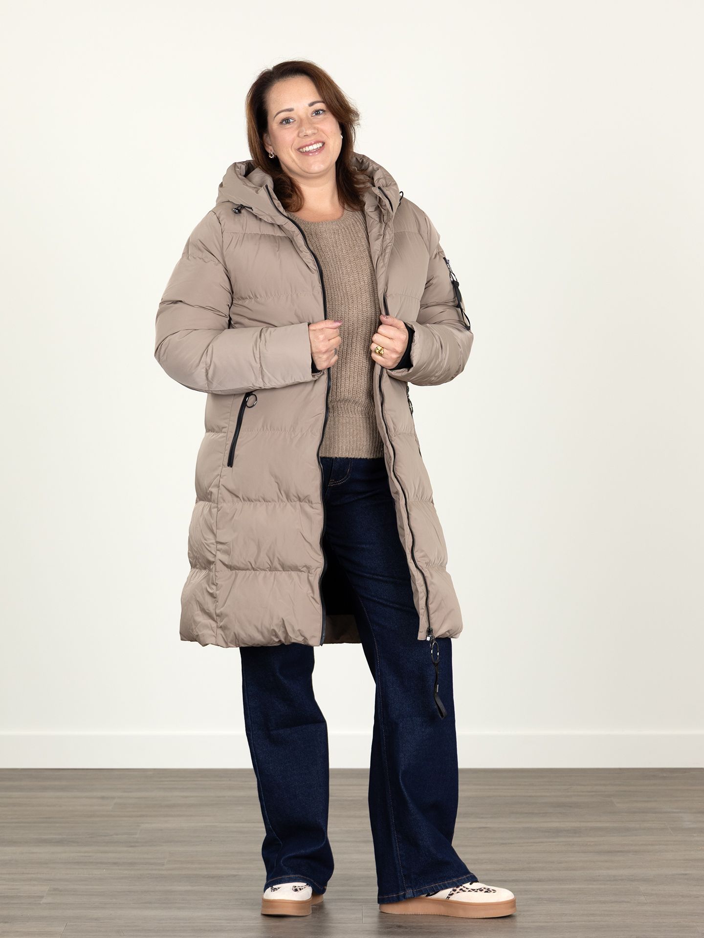 Stephanie is 1.68 m. zij draagt de jas in maat 40, de trui in maat L en de jeans in maat 42.