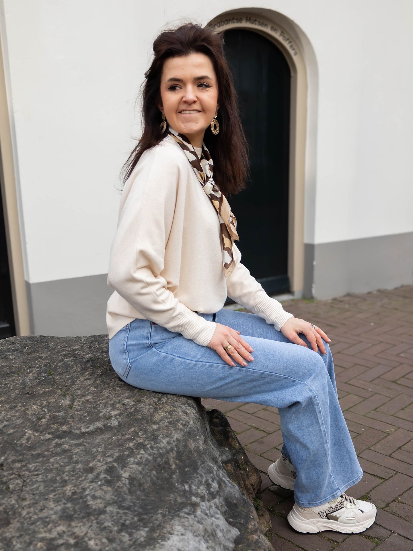 Semmy is 1,70 m. zij draagt de jeans in maat 36 en de trui in maat XS/S.